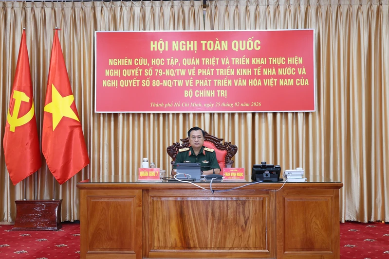 Tại điểm cầu Quân khu 7, Trung tướng Trần Vinh Ngọc, Bí thư Đảng ủy, Chính ủy Quân khu chủ trì hội nghị.