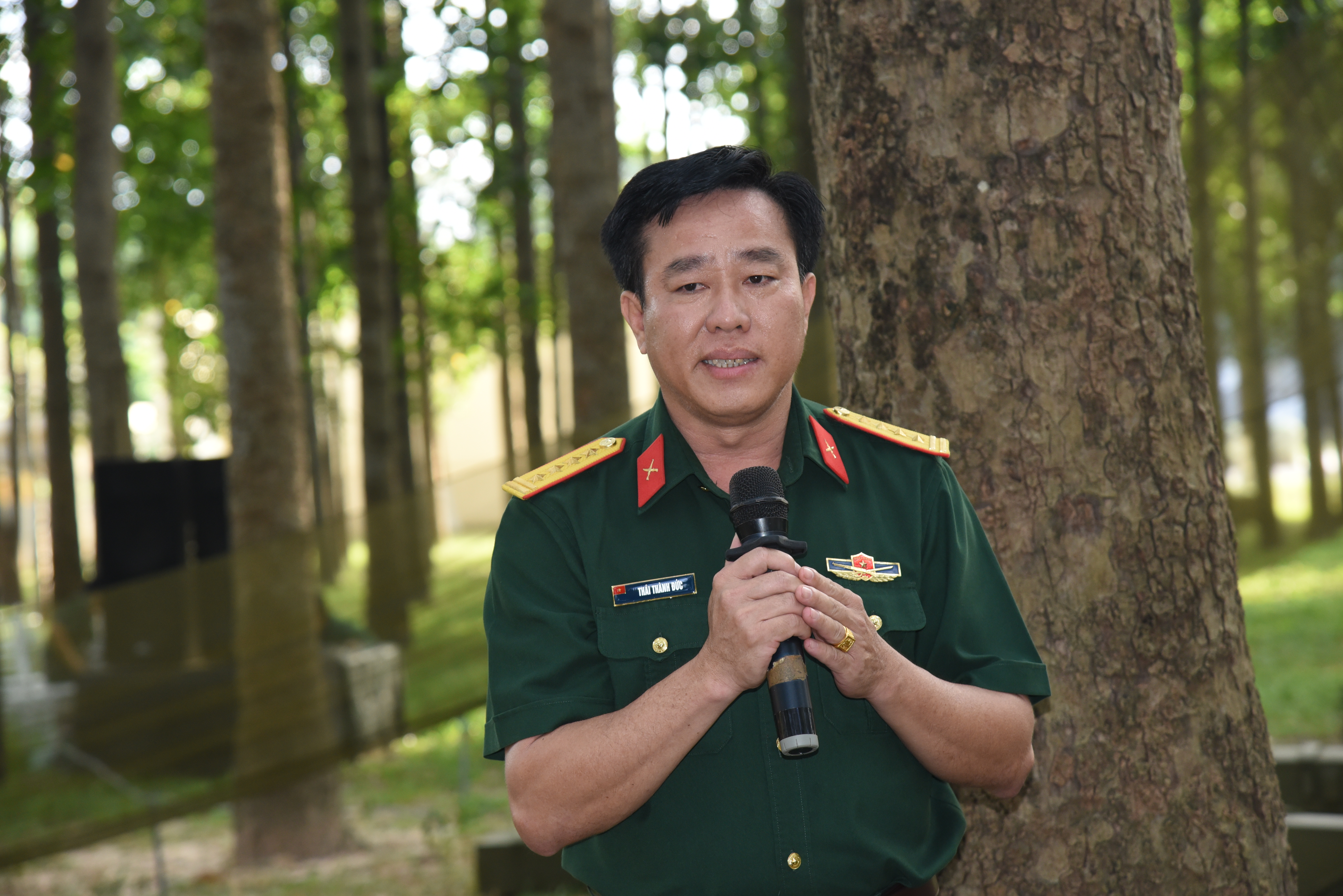 Đại tá Thái Thành Đức, Phó Chủ nhiệm Chính trị Quân khu 7 phát biểu tại họp báo.
