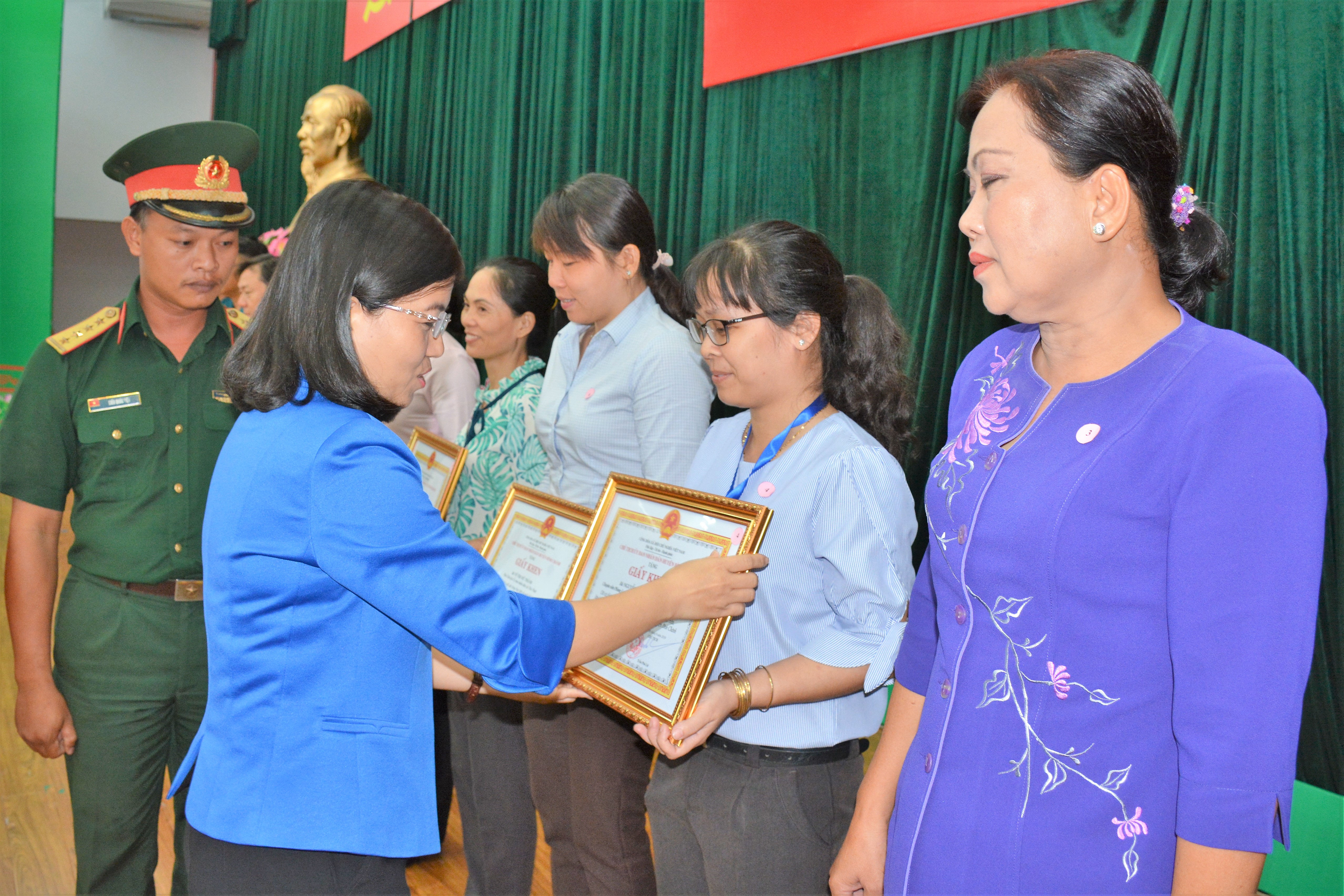Bà Nguyễn Thị Kim Dung, Phó Bí thư Thường trực huyện ủy tặng giấy khen cho các tập thể