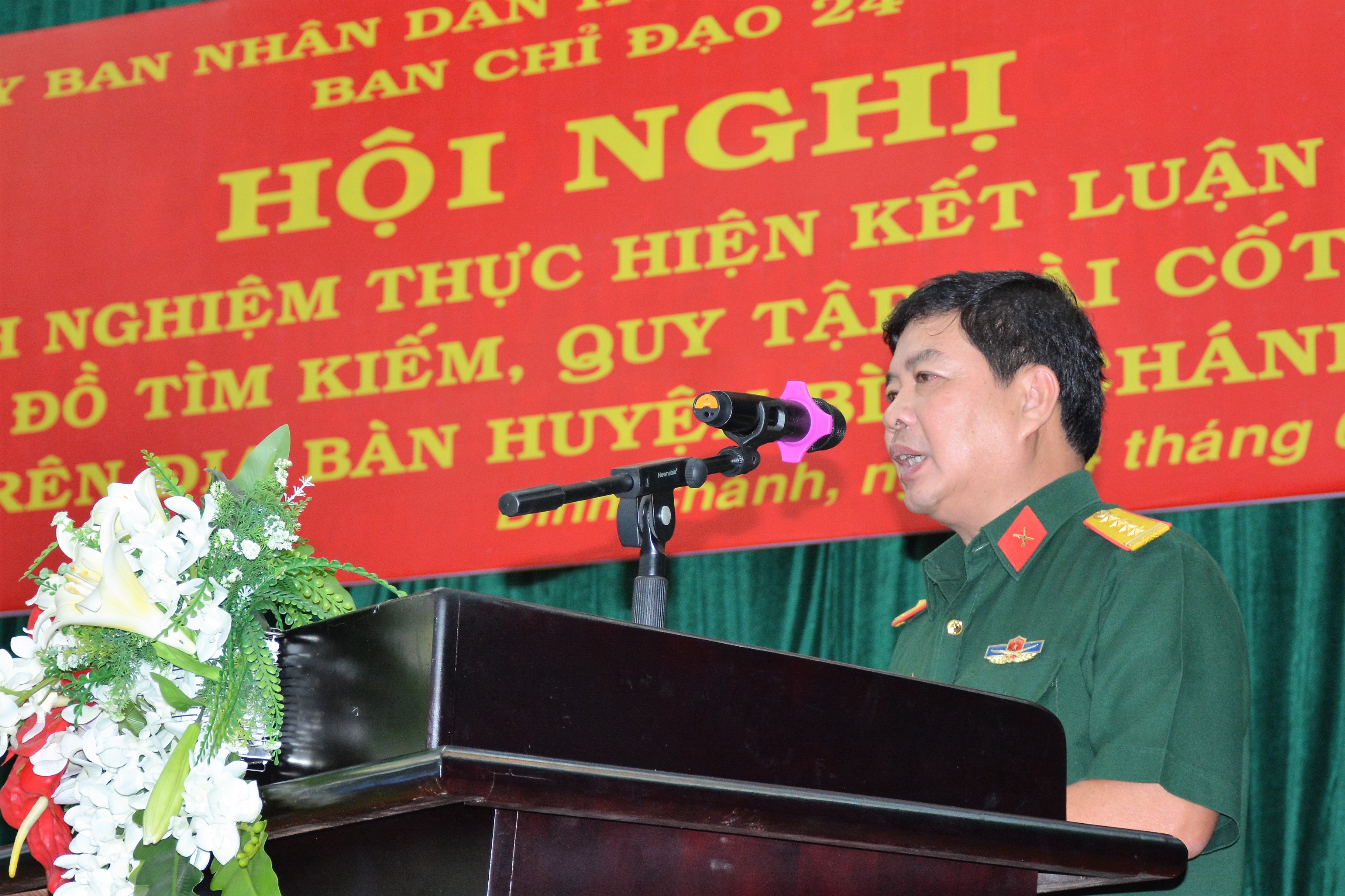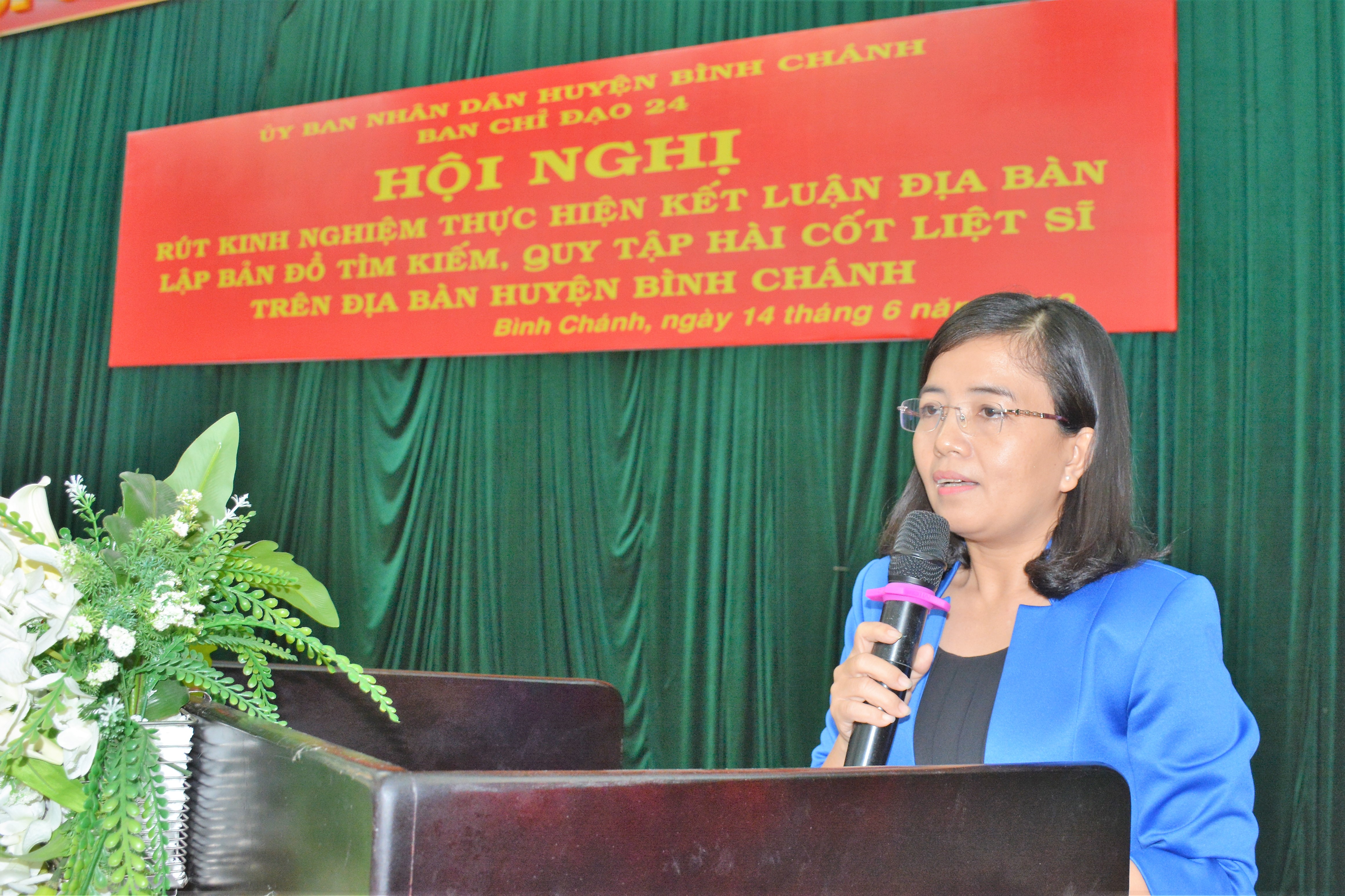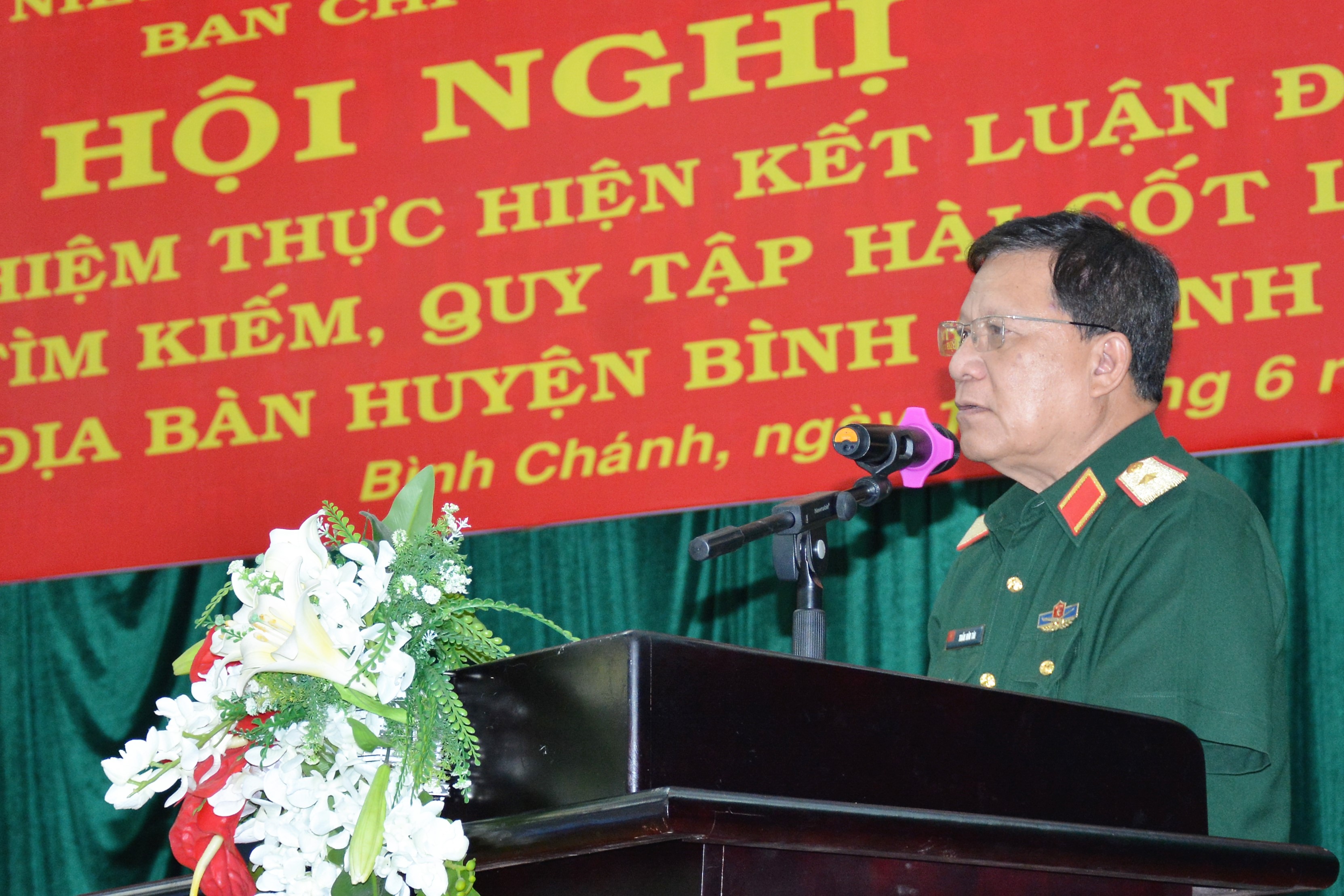 Phát biểu tại hội nghị, Thiếu tướng Trần Hữu Tài, Phó Chủ nhiệm Chính trị Quân khu 7 nhấn mạnh: Công tác tìm kiếm, quy tập hài cốt liệt sỹ là một trong những nội dung quan trọng của Đảng và Nhà nước về chính sách đền ơn đáp nghĩa, thể hiện đạo lý “Uống nước nhớ nguồn” của dân tộc. Đặc biệt việc lập bản đồ tìm kiếm, quy tập hài cốt liệt sĩ là hoạt động trọng tâm, cần được sự quan tâm thực hiện. Đồng chí Phó Chủ nhiệm Chính trị Quân khu yêu cầu Ban Chỉ đạo 24 huyện Bình Chánh tiếp tục đẩy mạnh công tác tuyên truyền sâu rộng chủ trương của Đảng và Nhà nước về nhiệm vụ tìm kiếm, quy tập hài cốt liệt sĩ đến các tầng lớp nhân dân. Tăng cường sự lãnh đạo, quản lý, điều hành của các cấp uỷ, chính quyền, phát huy sức mạnh tổng hợp của cả hệ thống chính trị, xã hội trong việc tìm kiếm, quy tập hài cốt liệt sĩ, góp phần đẩy nhanh và bảo đảm hoàn thành sớm việc tìm kiếm, quy tập hài cốt liệt sĩ trên địa bàn huyện.