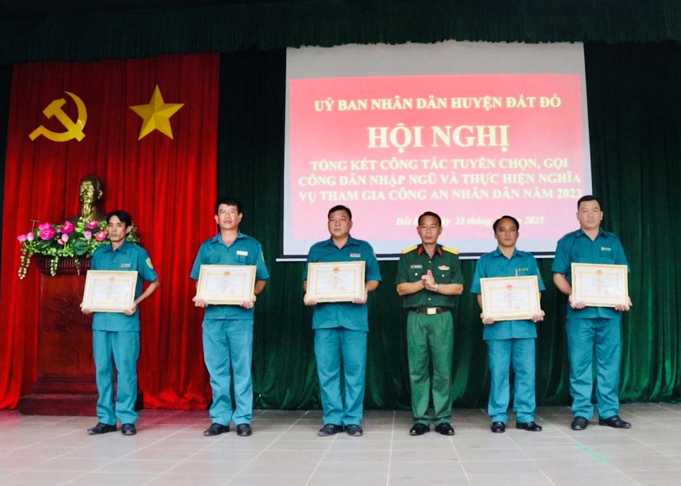 Dịp này, UBND huyện Đất Đỏ khen thưởng 5 tập thể, 10 cá nhân và 9 hộ gia đình tiêu biểu có thành tích xuất sắc trong công tác tuyển chọn, gọi công dân nhập ngũ 2023; 3 tập thể và 6 cá nhân có thành tích xuất sắc trong công tác tổ chức Hội trại tòng quân năm 2023.