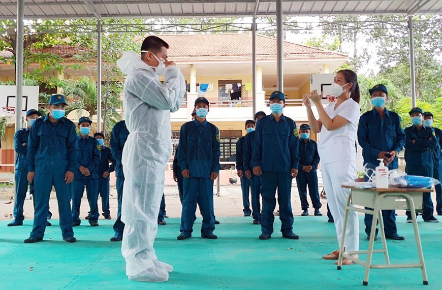Lực lượng tăng cường hướng dẫn cách mặc, cởi trang phục bảo hộ.