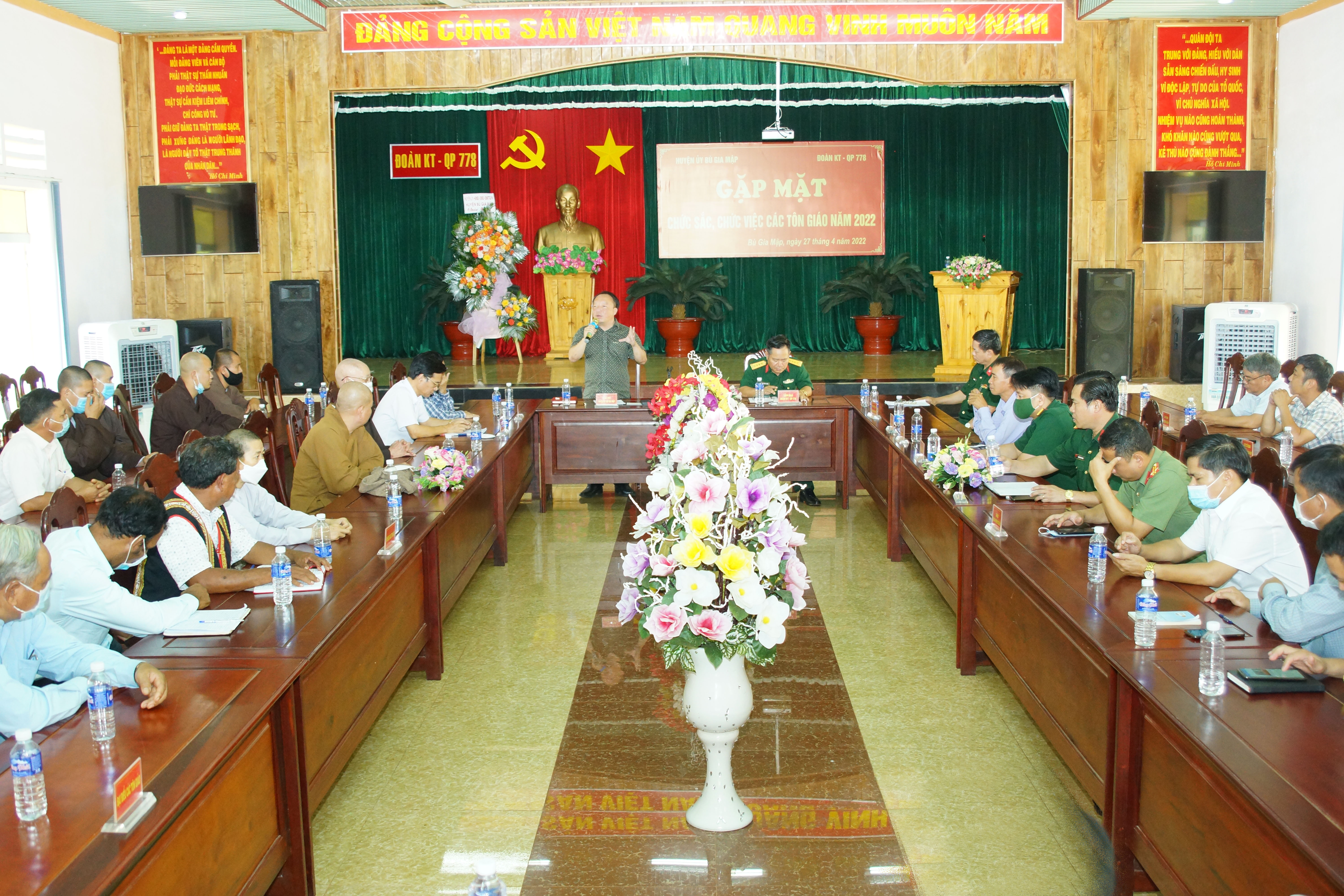 (QK7 Online) – Sáng 27 tháng 4, Huyện ủy Bù Gia Mập, tỉnh Bình Phước và Đoàn Kinh tế Quốc phòng 778 phối hợp tổ chức gặp mặt chức sắc, chức việc các tôn giáo năm 2022. Đồng chí Phan Xuân Linh, Phó Bí thư Thường trực Huyện ủy Bùa Gia Mập, Đại tá Nguyễn Duy Dương, Chính ủy Đoàn kinh tế Quốc phòng 778 đồng chủ trì buổi gặp mặt.