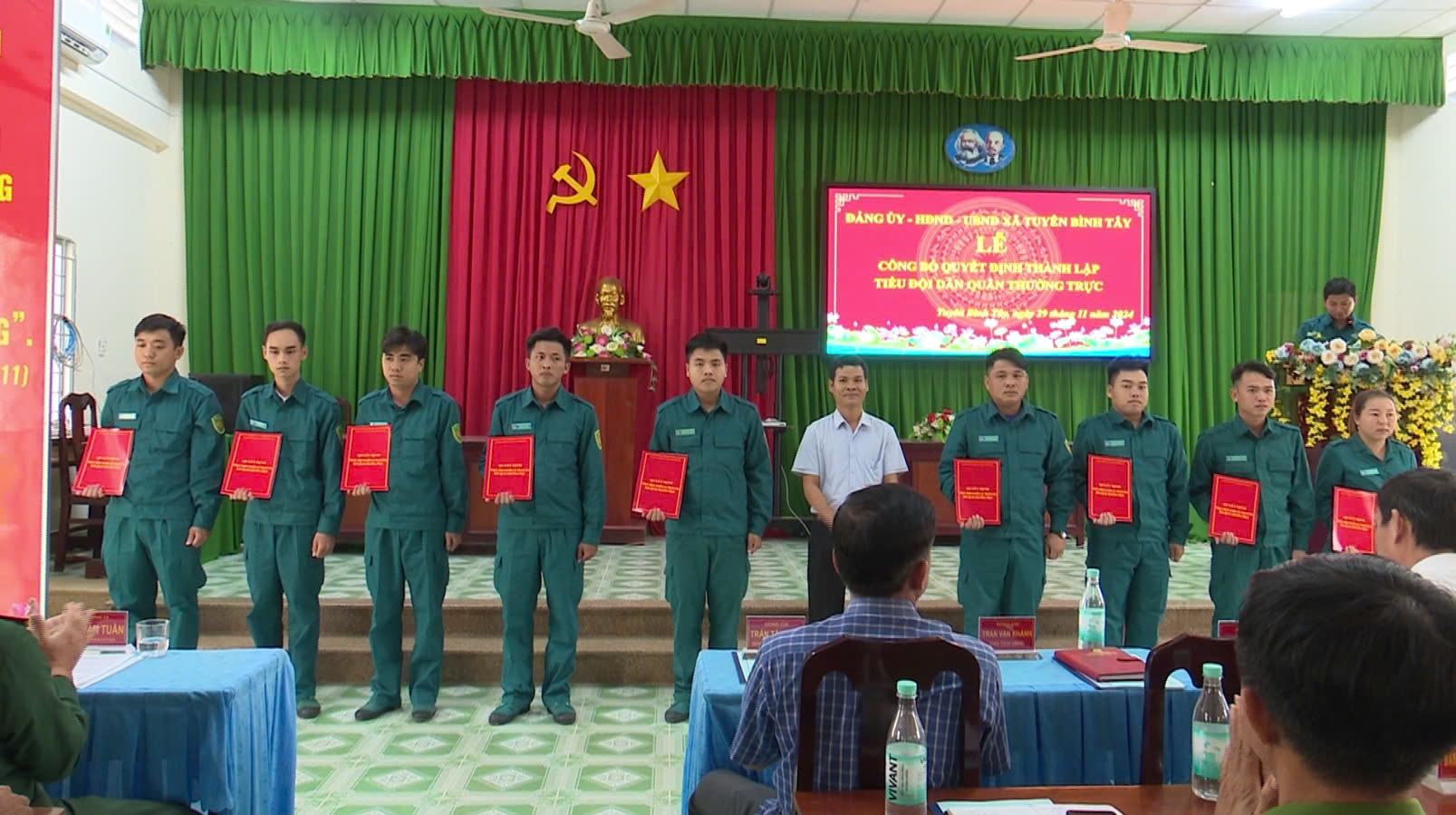 (QK7 Online) - Ngày 29/11, xã Tuyên Bình Tây, huyện Vĩnh Hưng, tỉnh Long An tổ chức Lễ công bố quyết định thành lập và ra mắt Tiểu đội dân quân thường trực xã. Dự Lễ có Thượng tá Võ Văn Tuấn, Chỉ huy trưởng, Ban CHQS huyện, Trung tá Hồ Quốc Danh, Chính trị viên Ban CHQS huyện.
