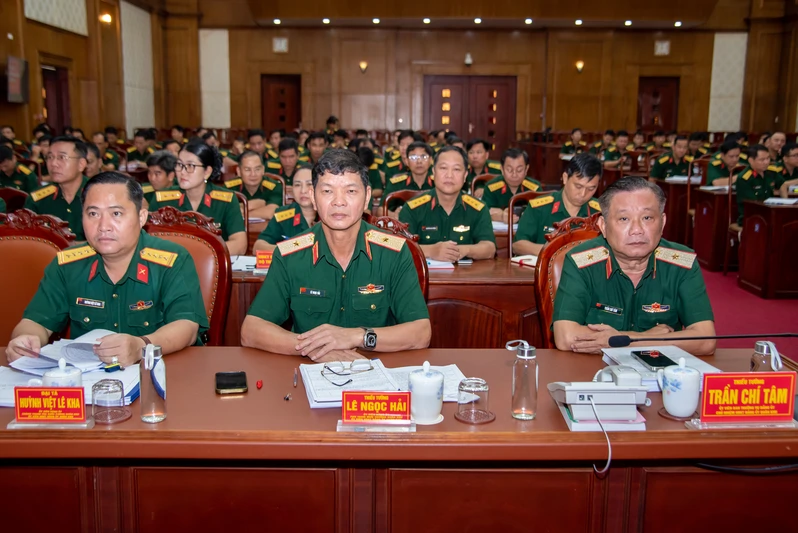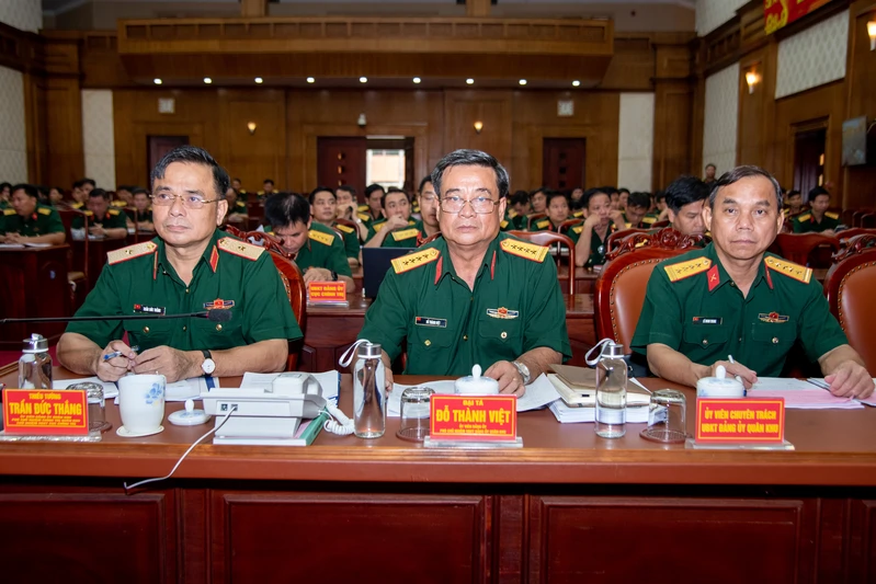 Thiếu tướng Trần Chí Tâm, Ủy viên Ban Thường vụ Đảng ủy, Chủ nhiệm Ủy ban Kiểm tra Đảng ủy Quân khu, Phó Chính ủy Quân khu (bên phải) cùng các đại biểu dự lớp tập huấn.