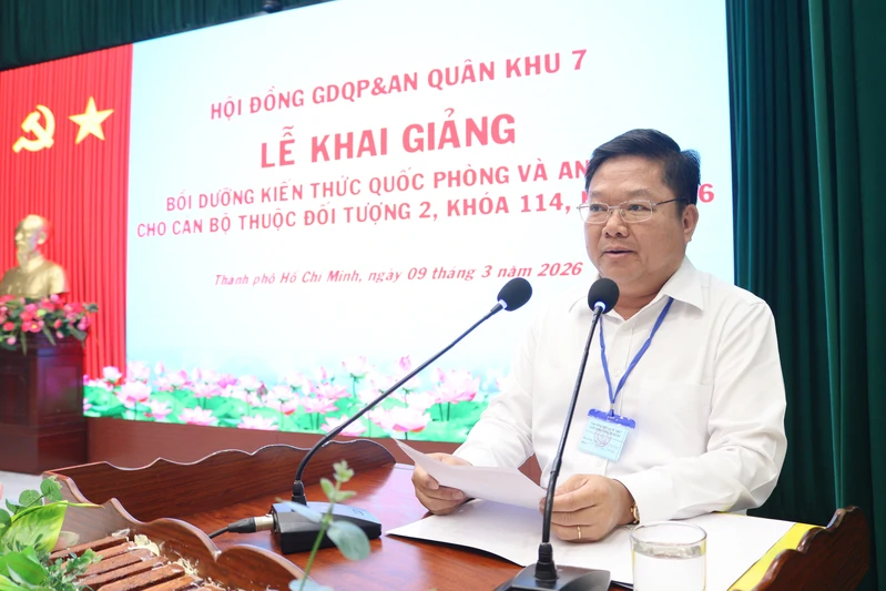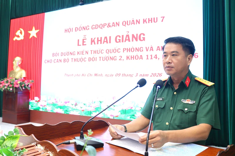 (QK7 Online) - Sáng 9/3, tại Trường Quân sự Quân khu 7, Bộ Tư lệnh Quân khu 7 tổ chức lễ khai giảng Lớp bồi dưỡng kiến thức quốc phòng và an ninh cho đối tượng 2, khóa 114 năm 2026. Đại tá Nguyễn Tấn Linh, Phó Tư lệnh Quân khu, Phó Chủ tịch Hội đồng Giáo dục quốc phòng và an ninh Quân khu dự và phát biểu khai giảng.