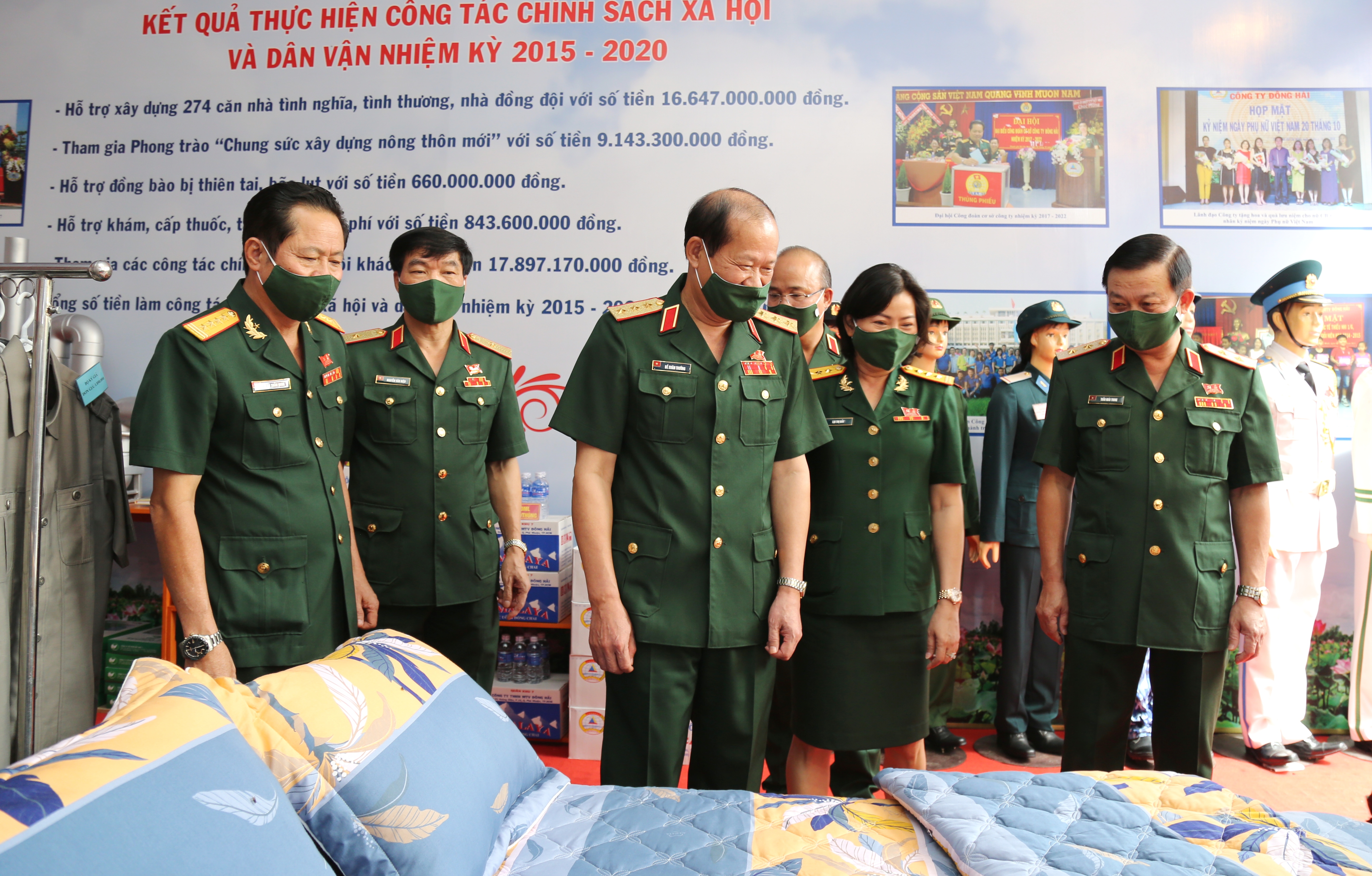 Thượng tướng Bế Xuân Trường (thứ 3 từ bên trái), Trung tướng Trần Hoài Trung (bên phải) và các đại biểu tham quan các mô hình, sản phẩm trưng bày tại đại hội.