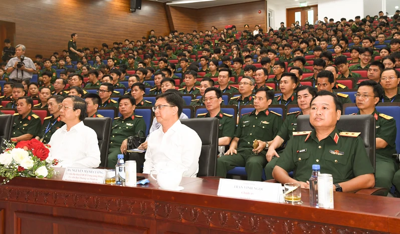 Từ phải qua: Trung tướng Trần Vinh Ngọc, Bí thư Đảng ủy, Chính ủy Quân khu 7; đồng chí Nguyễn Mạnh Cường, Phó Chủ tịch UBND Thành phố Hồ Chí Minh; đồng chí Phạm Ngọc Thưởng, Thứ trưởng Bộ Giáo dục và Đào tạo.