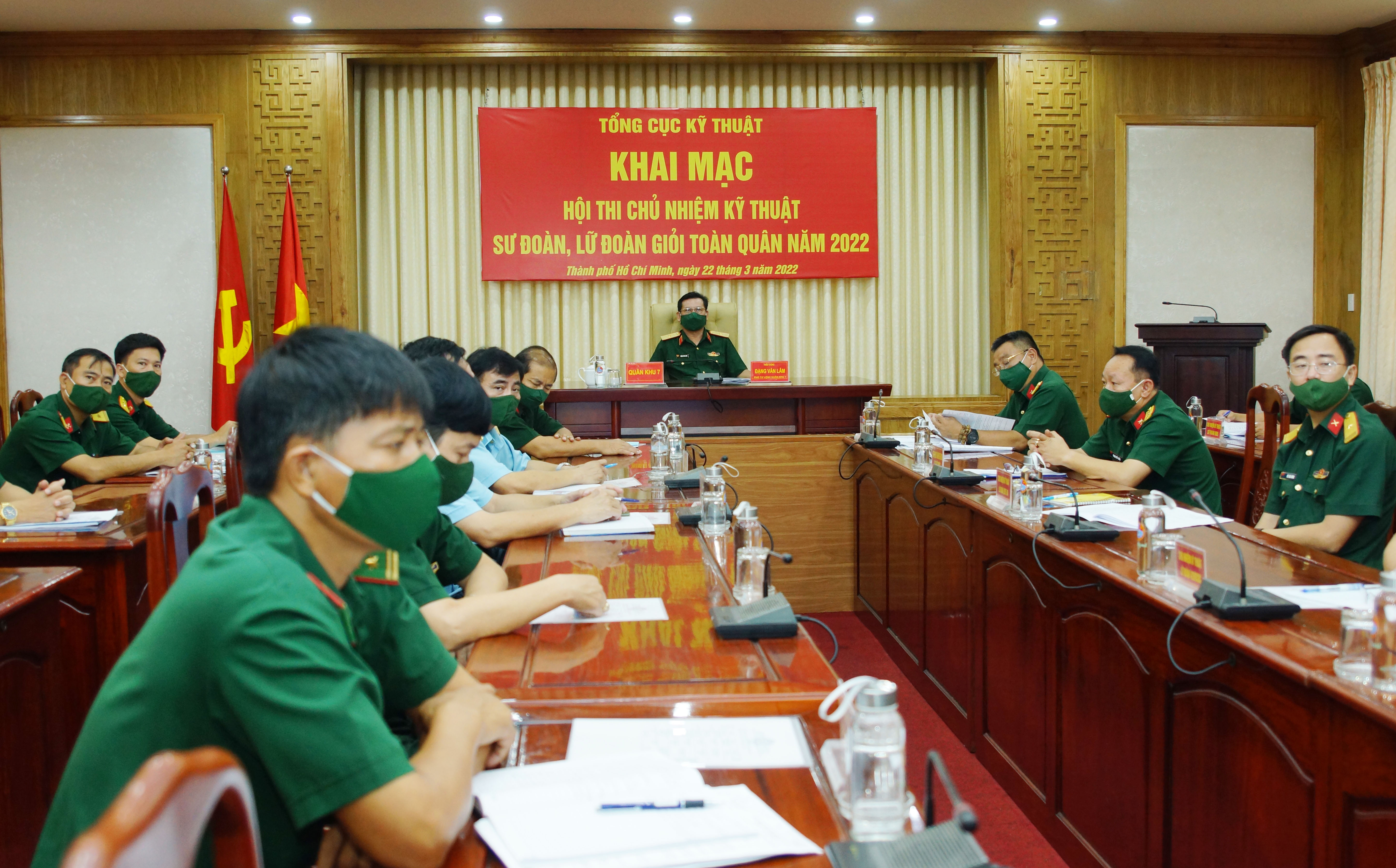 (QK7 Online) - Sáng 22 tháng 3, tại Hà Nội, Tổng cục Kỹ thuật khai mạc Hội thi Chủ nhiệm kỹ thuật sư đoàn, lữ đoàn giỏi toàn quân năm 2022. Lễ khai mạc được tổ chức trực tuyến từ sở chỉ huy Tổng cục Kỹ thuật, kết nối với 24 điểm cầu trong toàn quân.