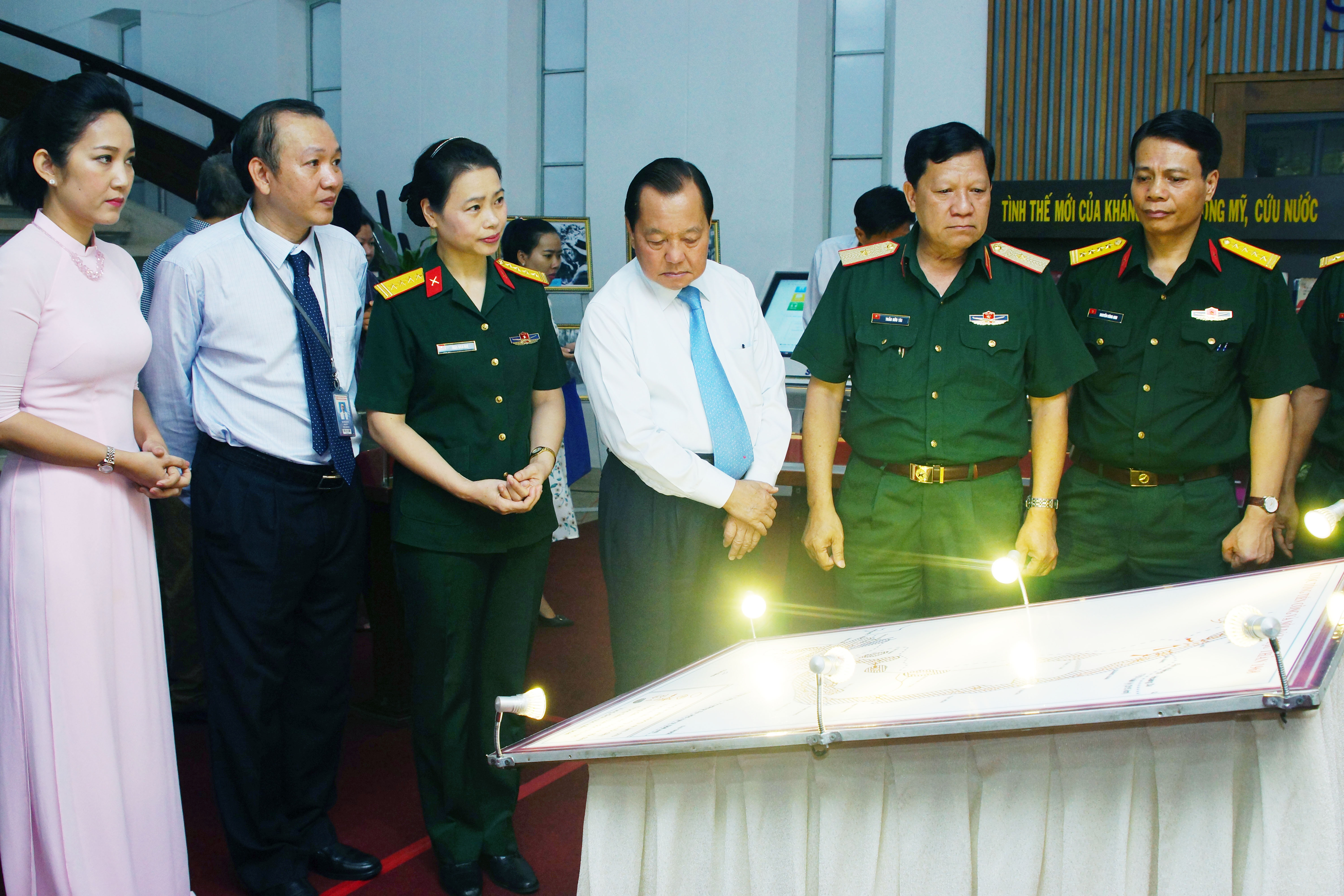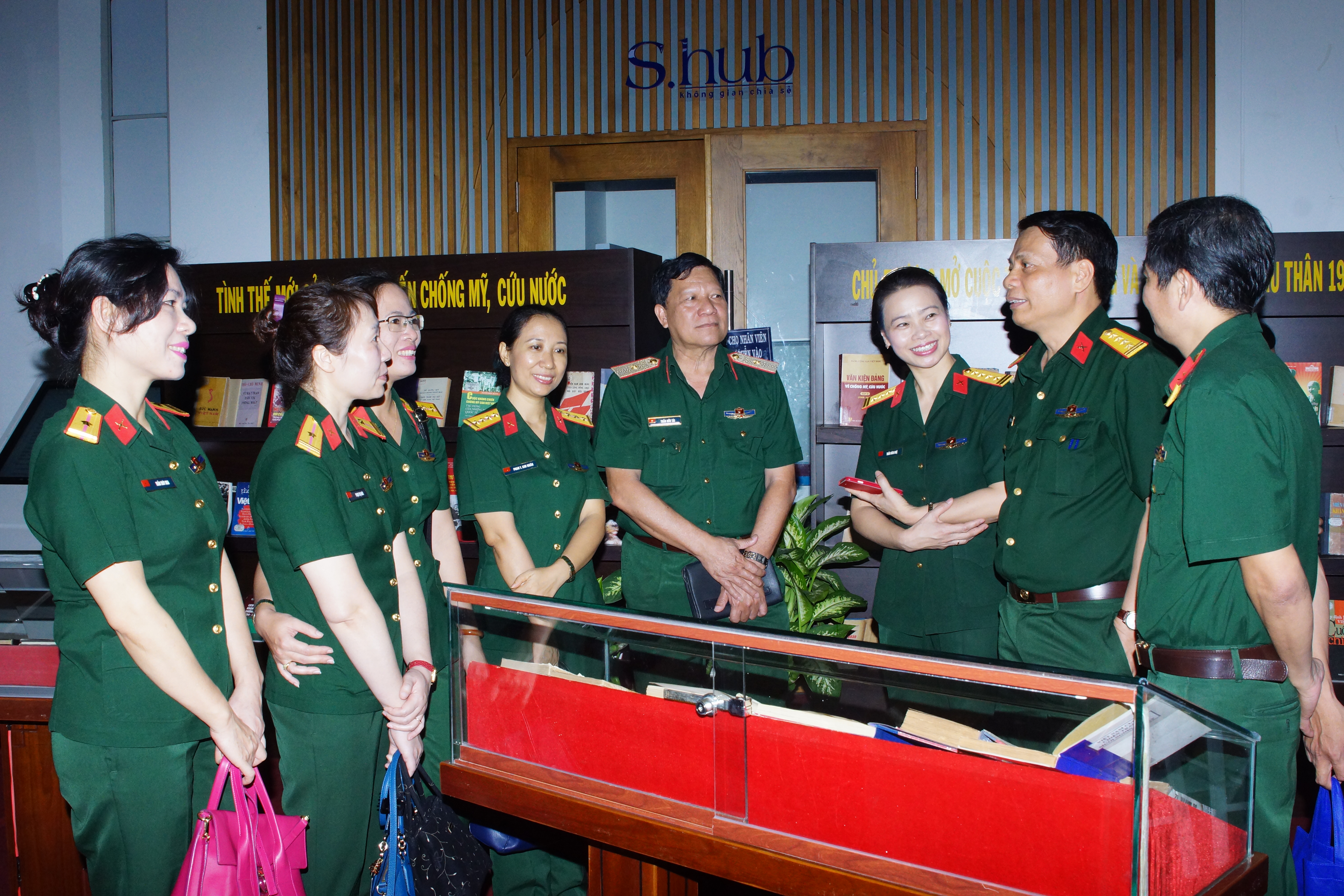 Thiếu tướng Trần Hữu Tài, Phó Chủ nhiệm Chính trị Quân khu 7 và Đại tá Trần Thị Bích Huệ, Giám đốc Thư viện Quân đội trao đổi thông tin triển lãm với các cơ quan chuyên môn Quân khu 7