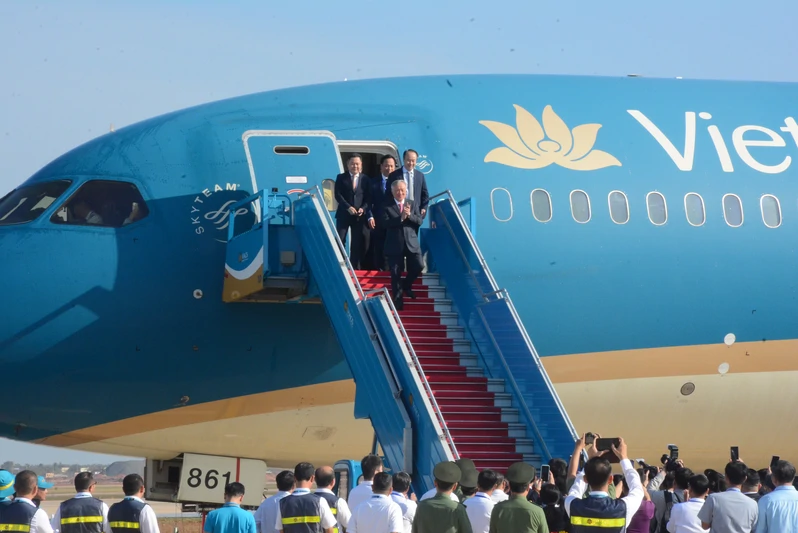 Phó thủ tướng Thường trực Nguyễn Hòa Bình và các đại biểu đi trên chuyến bay đầu tiên đến sân bay quốc tế Long Thành.