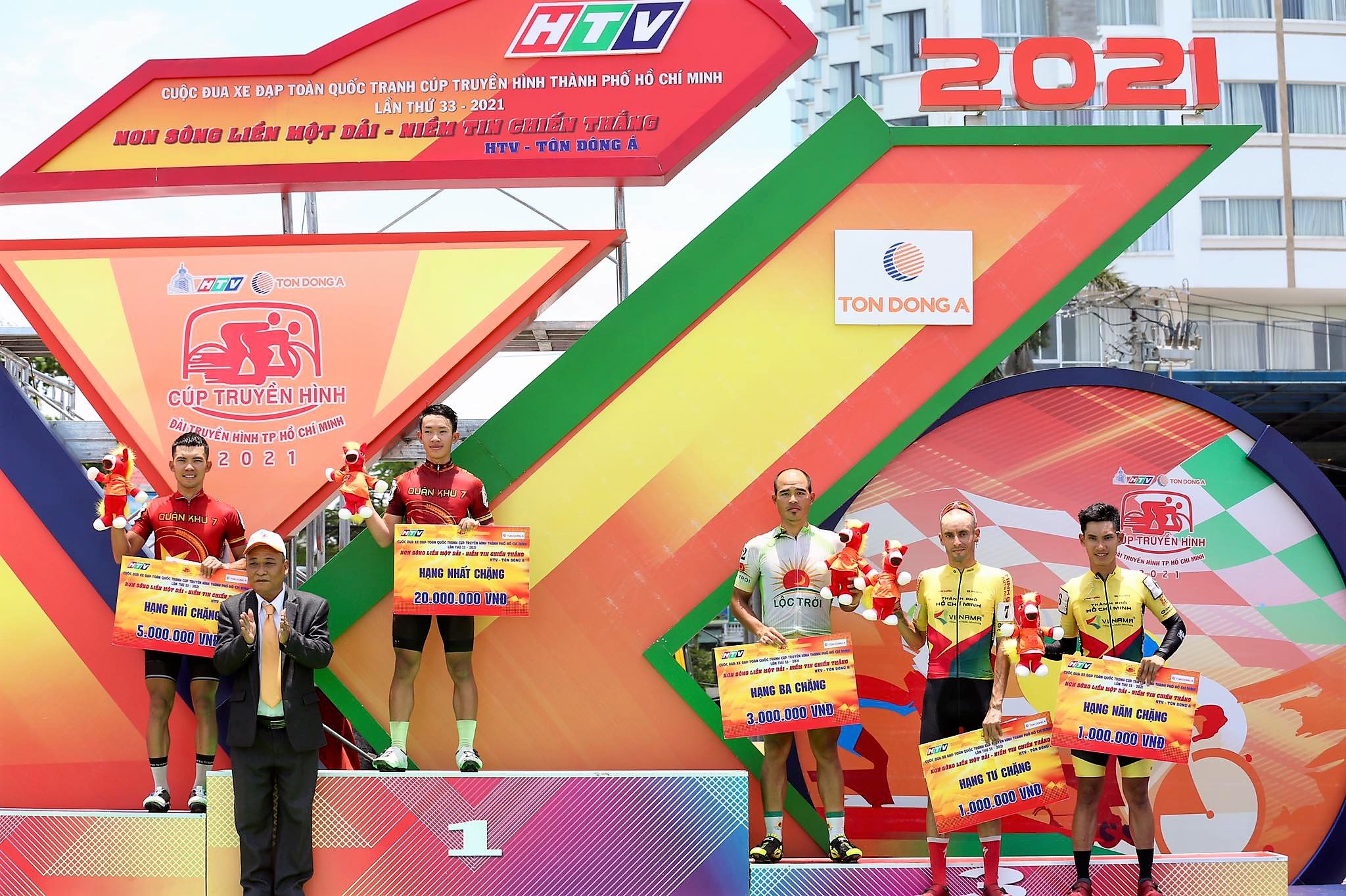 Các tay đua Quân khu 7 đạt giải nhất, nhì chặng 15 giải đua xe đạp toàn quốc Cúp Truyền hình Thành phố Hồ Chí Minh lần thứ 33 năm 2021. Ảnh: CTV