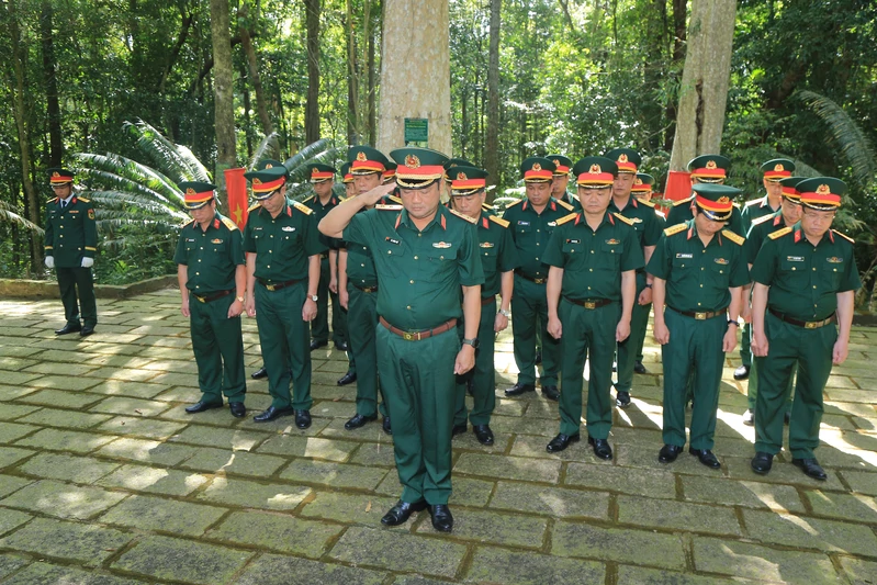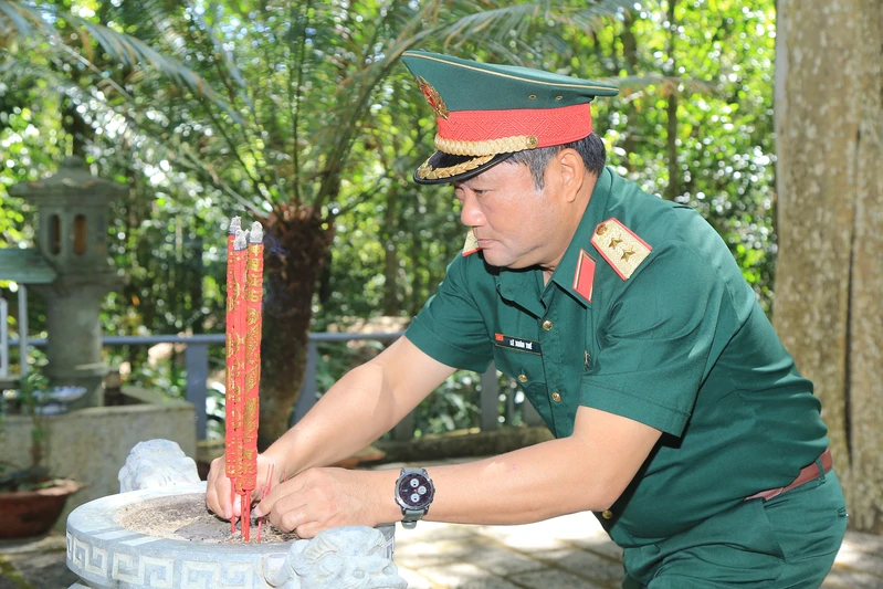 Trung tướng Lê Xuân Thế, Tư lệnh Quân khu dâng hương thành kính trước anh linh Chủ tịch Hồ Chí Minh, các vị lão thành cách mạng, anh hùng liệt sĩ tại Di tích Căn cứ Trung ương Cục miền Nam, xã Trị An, tỉnh Đồng Nai.