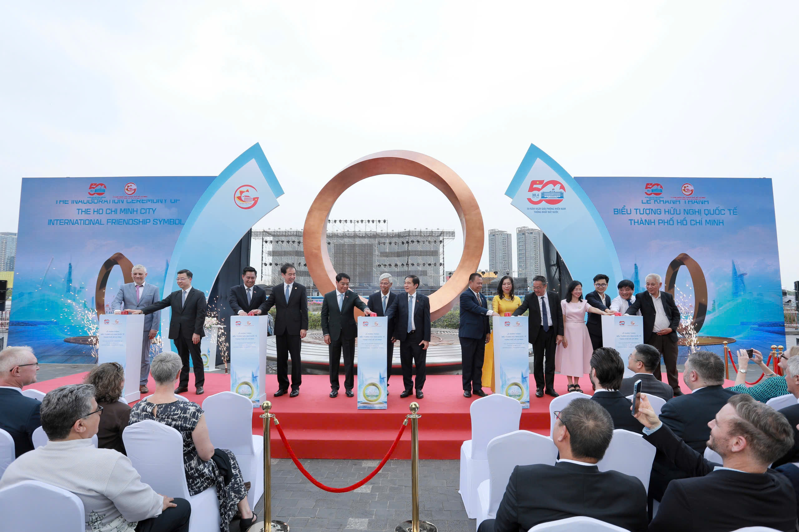 Đại biểu nhấn nút khai trương công trình biểu tượng hữu nghị quốc tế nhân kỷ niệm 50 năm thống nhất đất nước.