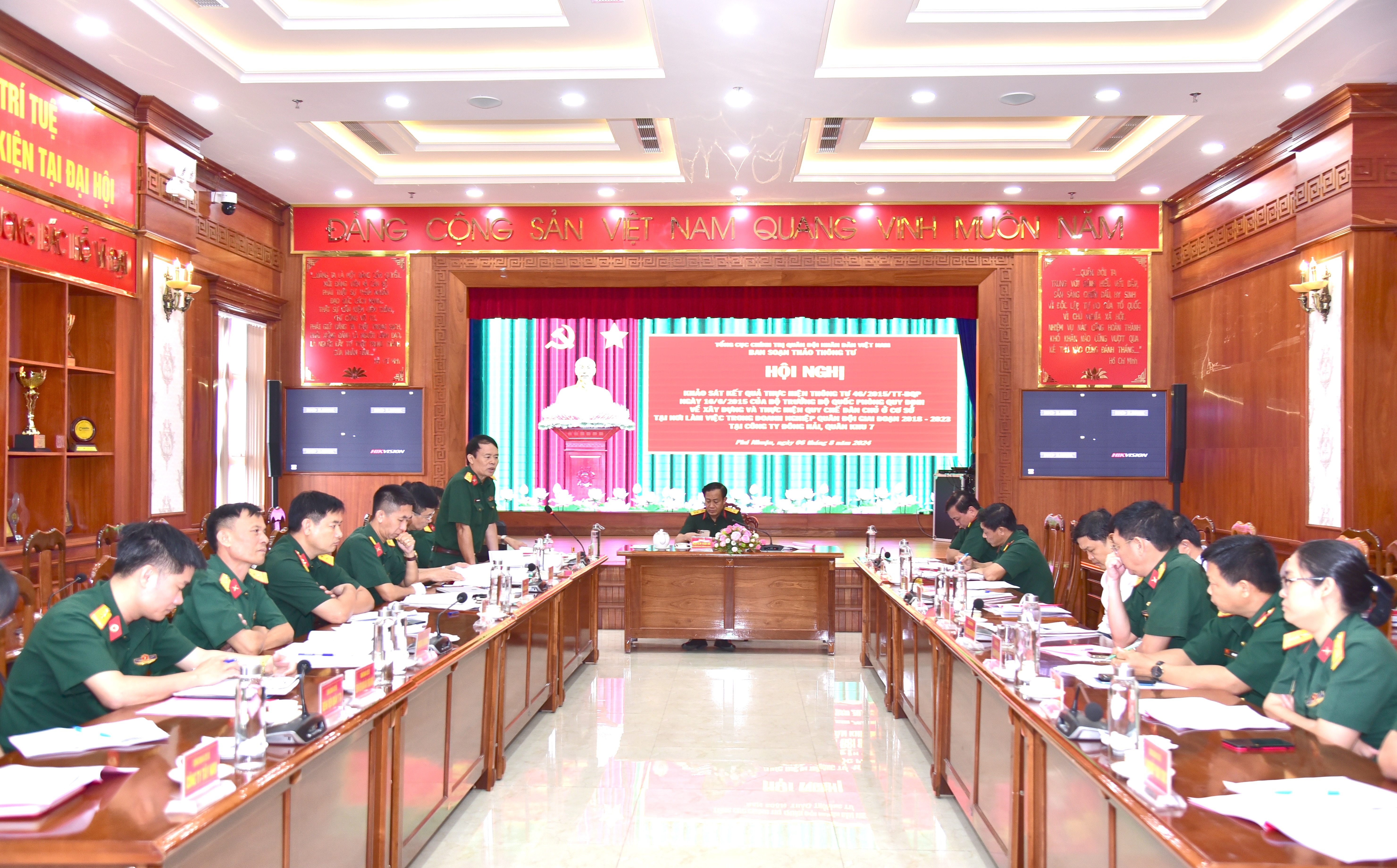 (QK7 Online) - Ngày 6/8, Ban soạn thảo Thông tư 46, Tổng cục Chính trị Quân đội nhân dân Việt Nam khảo sát kết quả thực hiện Thông tư 46 của Bộ trưởng Bộ Quốc phòng quy định về xây dựng và thực hiện dân chủ ở cơ sở tại nơi làm việc trong doanh nghiệp Quân đội, giai đoạn 2018 – 2023 tại Công ty Đông Hải, Quân khu 7.
