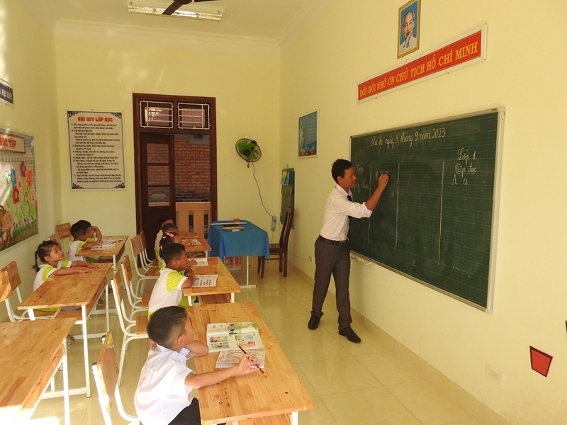 Thầy giáo Nguyễn Công Qua trong giờ dạy học ngay sau lễ khai giảng.