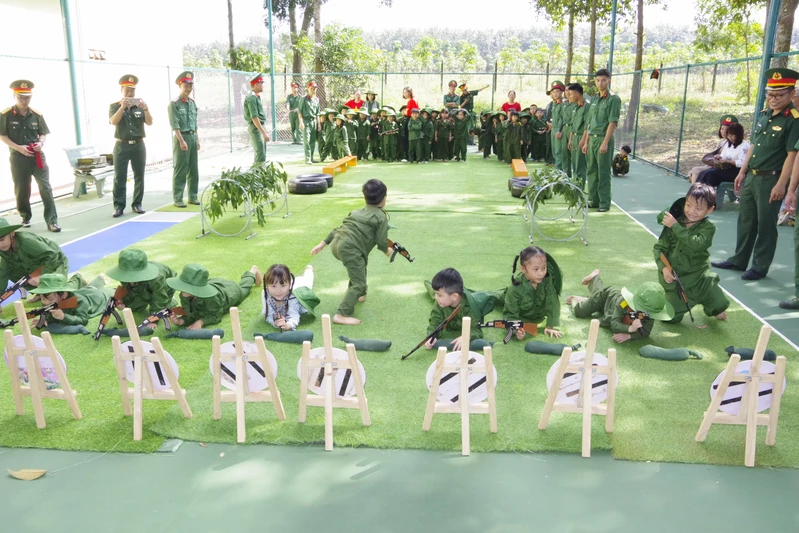 Các em học sinh Trường mầm non Hướng Dương tham gia hoạt động trải nghiệm “Bé tập làm chú Bộ đội” cùng cán bộ, chiến sĩ Kho K6.