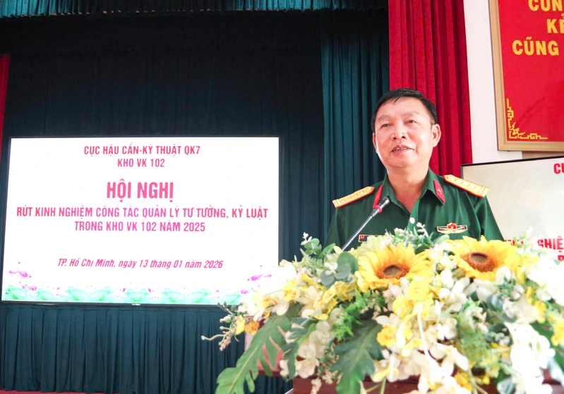 Phát biểu kết luận hội nghị, Đại tá Trần Văn Long, Phó Chính ủy Cục Hậu cần - Kỹ thuật Quân khu ghi nhận, biểu dương những kết quả mà Kho VK102 đạt được trong công tác quản lý tư tưởng, kỷ luật năm 2025. Đồng thời yêu cầu cấp ủy, chỉ huy các cấp tiếp tục quán triệt sâu sắc các nghị quyết, chỉ thị của trên; tăng cường công tác giáo dục chính trị, pháp luật; chủ động nắm bắt, dự báo tình hình tư tưởng bộ đội; kịp thời giải quyết tốt các mối quan hệ, không để bị động, bất ngờ; gắn công tác quản lý tư tưởng với xây dựng nền nếp chính quy, rèn luyện kỷ luật, góp phần xây dựng Kho VK102 vững mạnh toàn diện “Mẫu mực, tiêu biểu”, hoàn thành thắng lợi nhiệm vụ trong năm 2026.