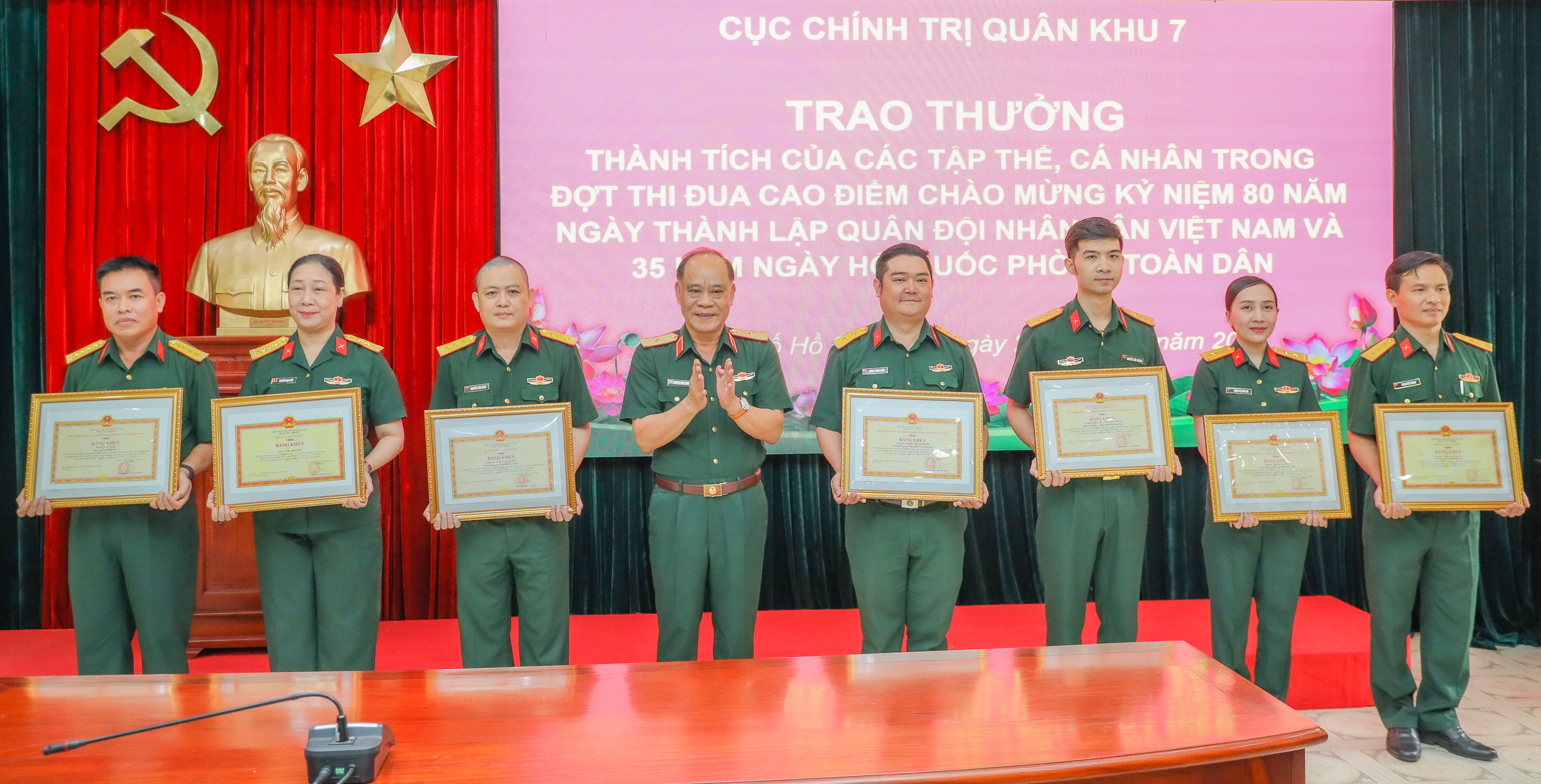 Cùng ngày, thừa ủy quyền của Bộ Quốc phòng, Tổng cục Chính trị và Bộ Tư lệnh Quân khu, Cục Chính trị Quân khu đã trao bằng khen cho hai tập thể và năm cá nhân thuộc Cục Chính trị Quân khu vì đã có thành tích xuất sắc trong đợt thi đua cao điểm chào mừng kỷ niệm 80 năm Ngày thành lập Quân đội Nhân dân Việt Nam và 35 năm Ngày hội Quốc phòng toàn dân.