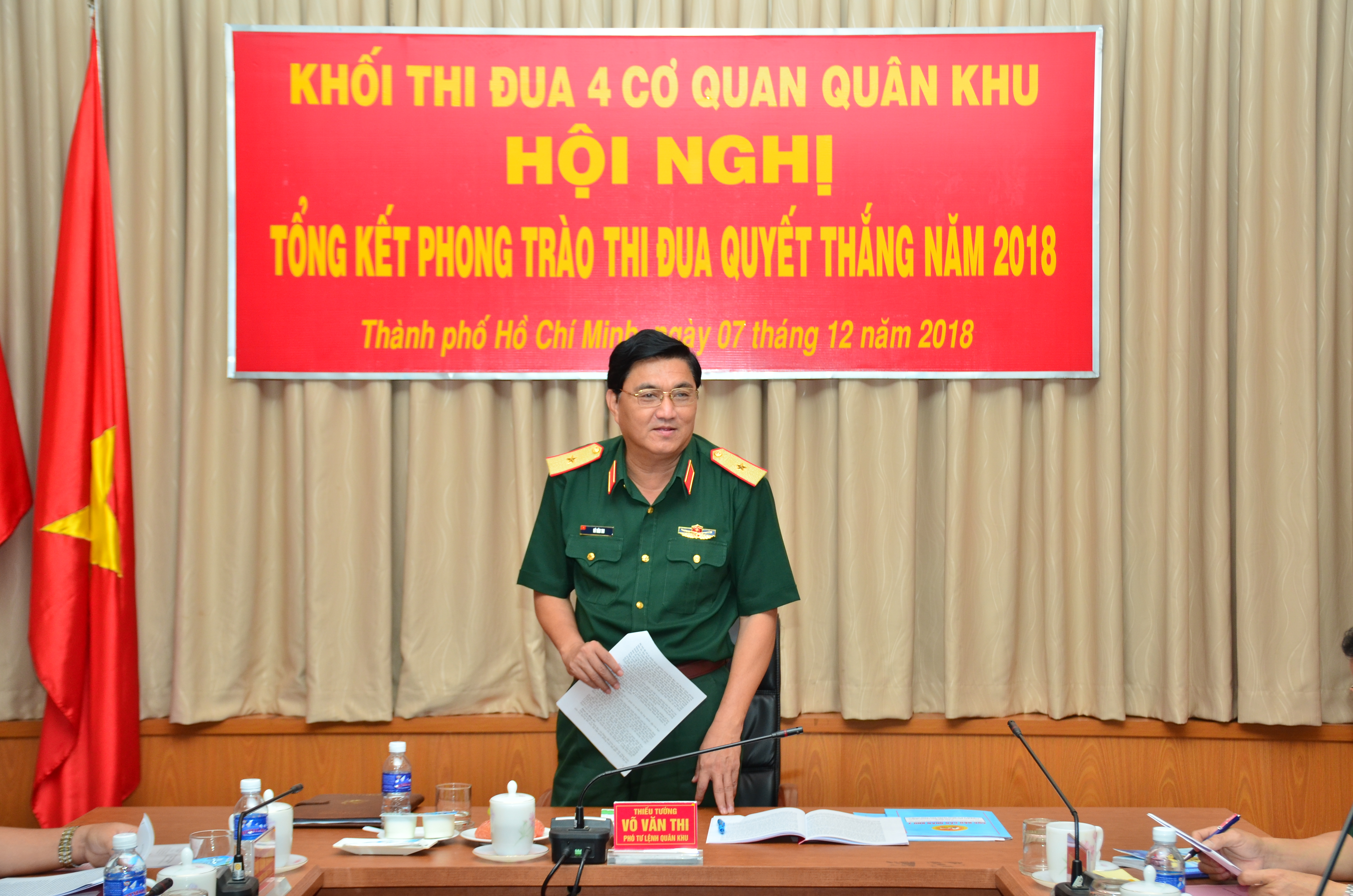 Thiếu tướng Võ Văn Thi đánh giá cao những kết quả mà các cơ quan đã thực hiện trong năm 2018. Đồng chí Phó Tư lệnh yêu cầu trong tháng còn lại của năm 2018, các cơ quan phải tập trung hơn nữa vào các nhiệm vụ đảm bảo an toàn cho các ngày lễ, tết cũng như làm tốt công tác tham mưu cho Đảng ủy – Bộ Tư lệnh Quân khu 7 lãnh đạo, chỉ đạo lực lượng vũ trang Quân khu 7 hoàn thành tốt nhiệm vụ quân sự - quốc phòng. Thực hiện và duy trì tốt các mô hình, cách làm sáng tạo, phát hiện và nhân rộng gương điển hình tiên tiến trong các cơ quan để cùng học tập và trao đổi kinh nghiệm đạt hiệu quả thiết thực, góp phần đưa phong trào thi đua quyết thắng ngày càng có chất lượng tốt hơn.