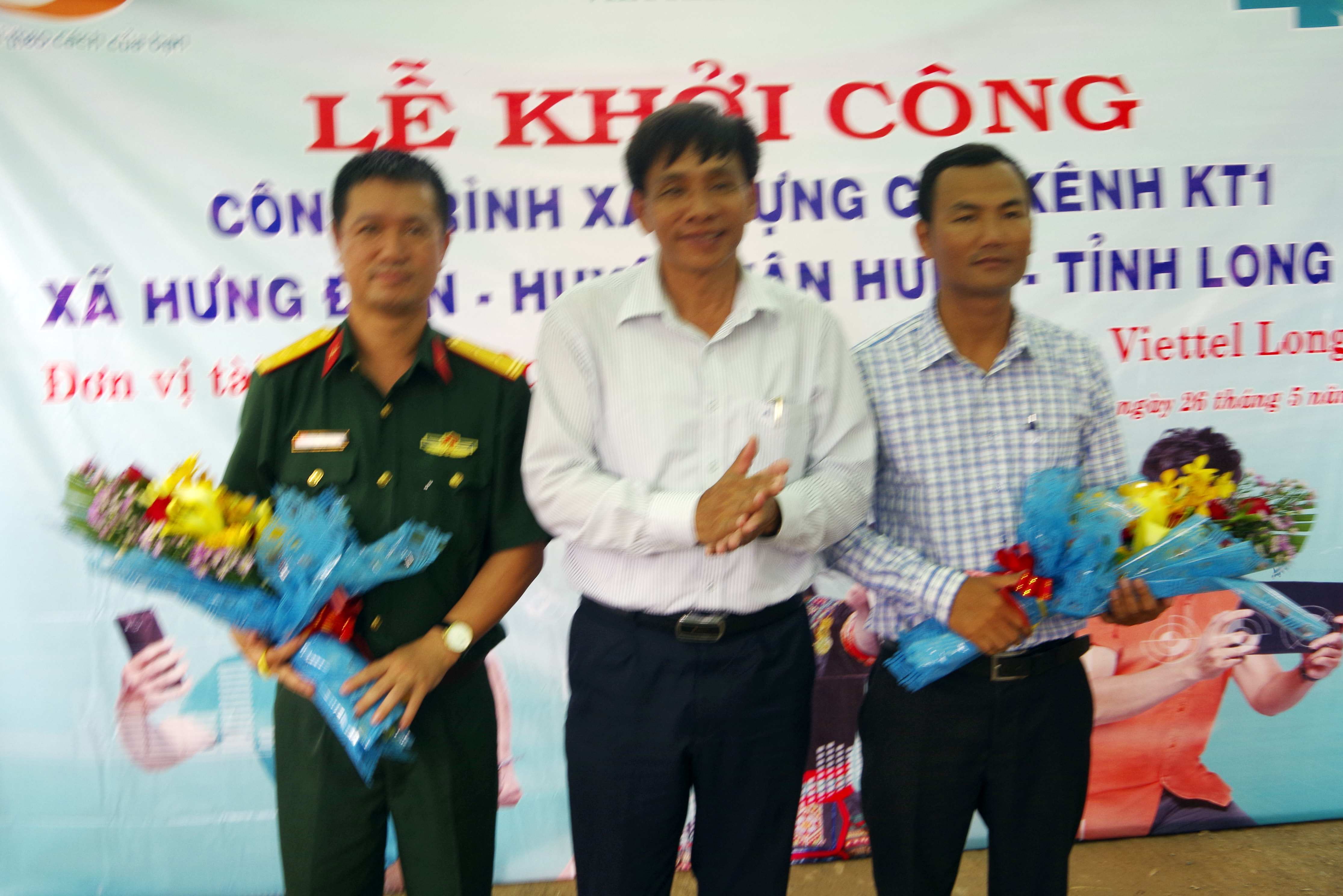 UBND huyện Tân Hưng tặng hoa cho nhà tài trợ, đơn vị thi công tại lễ khởi công xây dựng cầu Kênh T1