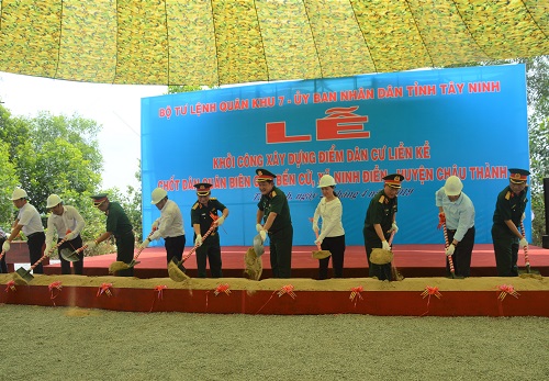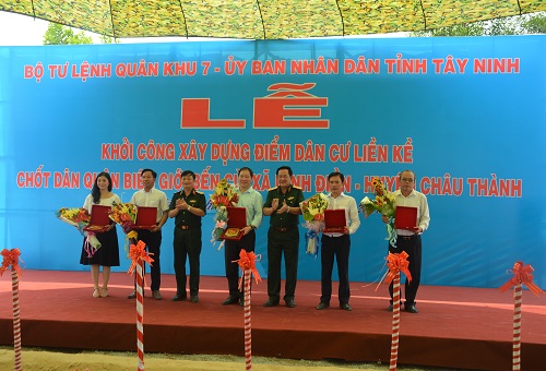 (QK7 Online) - Ngày 25/4, tại xã Ninh Điền huyện Châu Thành, Bộ Tư lệnh Quân khu 7 phối hợp với UBND tỉnh Tây Ninh tiến hành khởi công xây dựng điểm dân cư liền kề chốt dân quân biên giới Bến Cừ. Dự lễ khởi công có đồng chí Trung tướng Võ Minh Lương, UVTW Đảng, Tư lệnh Quân khu 7; Trung tướng Trần Hoài Trung, Bí thư Đảng ủy, Chính ủy Quân khu; Trung tướng Triệu Xuân Hòa, nguyên Tư lệnh Quân khu 7; Thiếu tướng Nguyễn Minh Hoàng, Phó Chính ủy Quân khu; đồng chí Phạm Ngọc Tân, Phó Bí thư Tỉnh ủy, Chủ tịch UBND tỉnh Tây Ninh; Thủ trưởng các cơ quan Quân khu; lãnh đạo huyện Châu Thành tỉnh Tây Ninh và đại diện các nhà đầu tư trong và ngoài Quân đội.