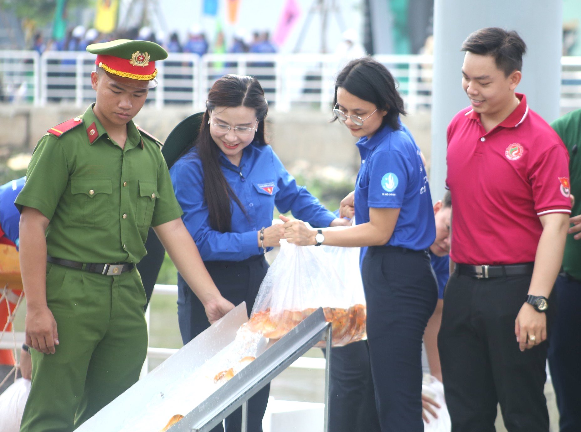 Hoạt động thả cá giống tái tạo nguồn lợi thủy sản trên lưu vực sông Sài Gòn (Ảnh: Kiên Cường).