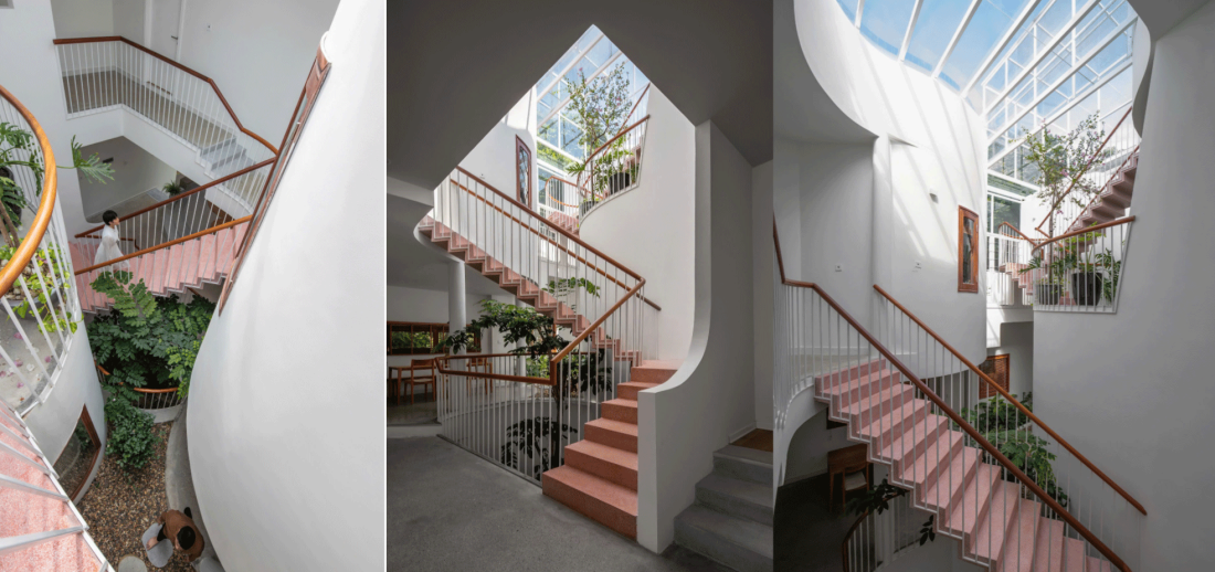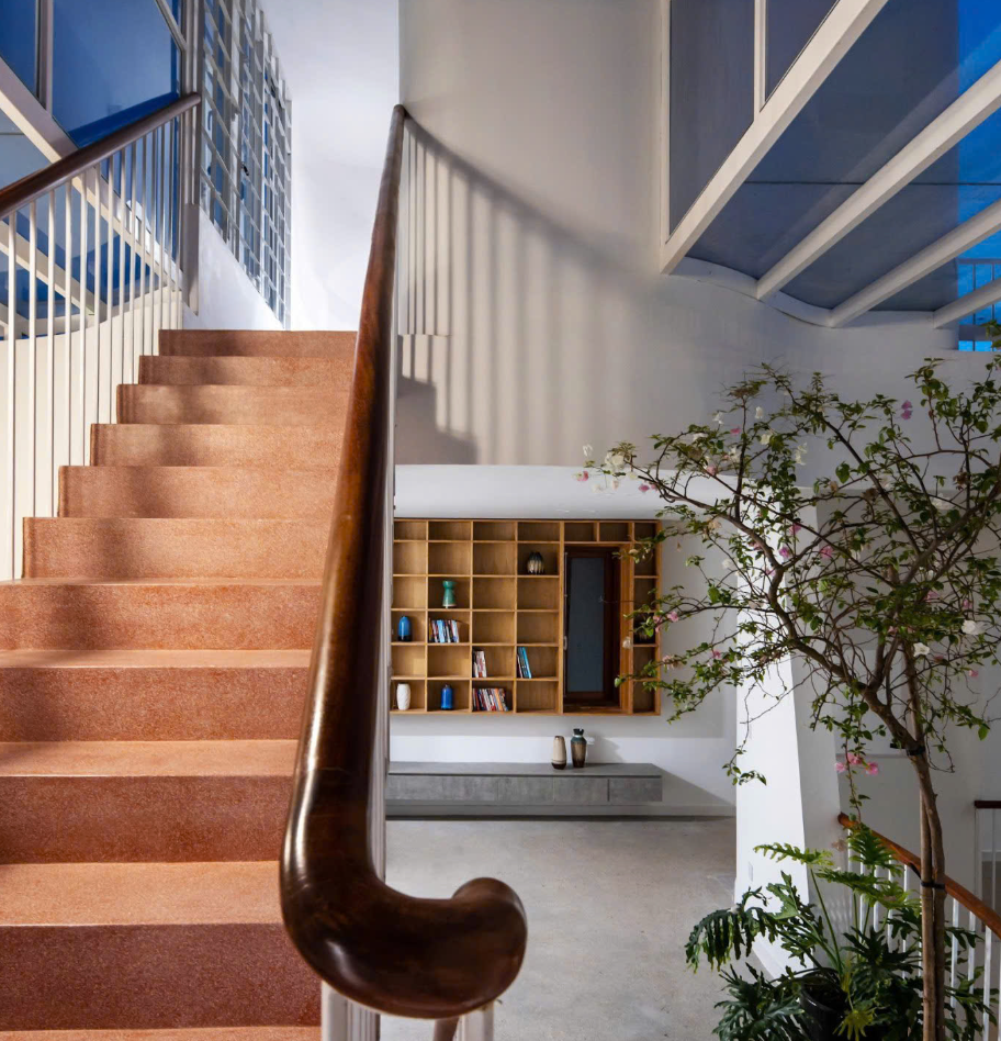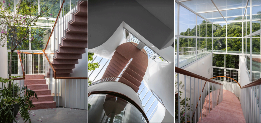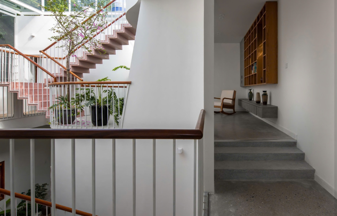 Tại mỗi điểm dừng trên cầu thang hay hành lang, gia chủ đều có thể phóng tầm mắt qua những vết cắt kiến trúc để nhìn thấy cây xanh, nhìn thấy bầu trời hoặc nhìn thấy các thành viên khác đang sinh hoạt phía dưới.