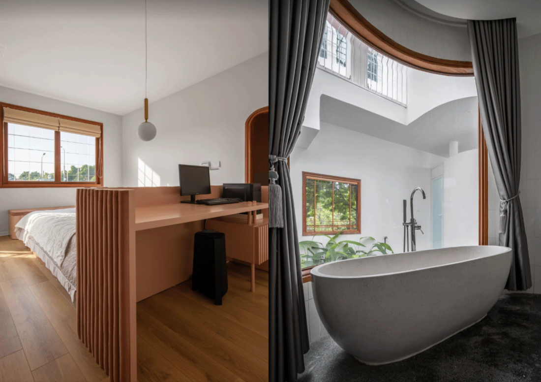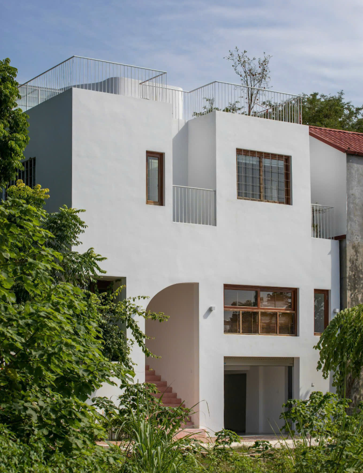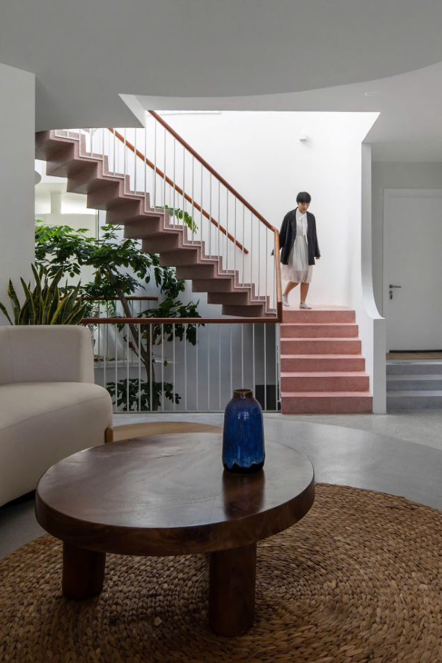 Tuy nhiên, ngay khi bước qua cánh cửa, sự vuông vức nhường chỗ cho những đường cong uốn lượn mềm mại. Lõi nhà được thiết kế rỗng, đóng vai trò là lá phổi xanh của công trình. Đây là nơi hội tụ của ánh sáng tự nhiên, gió sông và những tán cây xanh mát.