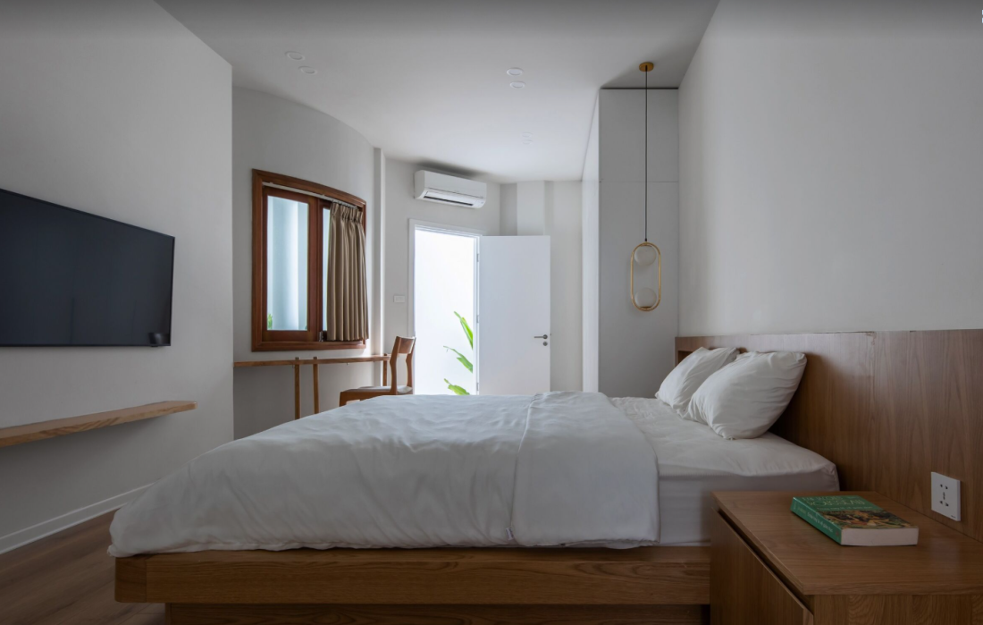 Ngay khi chạm tay vào cánh cửa và bước qua, không gian đột ngột nở ra với một sự phóng khoáng tuyệt đối. Tầm nhìn được mở rộng ra các khoảng thông tầng, nơi ánh sáng đổ xuống từ mái nhà và gió sông luồn qua những khe hở, tạo nên một sự tương phản mạnh mẽ với cảm giác chật hẹp trước đó. Đây chính là nghệ thuật sắp đặt không gian, biến mỗi lần trở về nhà đều thành một trải nghiệm mới mẻ.