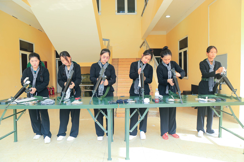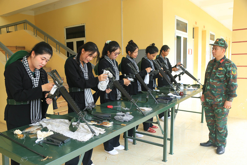 Nữ du kích Trần Thị Thu Thảo (thứ ba từ trái qua) cùng đồng đội tiến hành bảo quản vũ khí sau giờ huấn luyện điều lệnh.