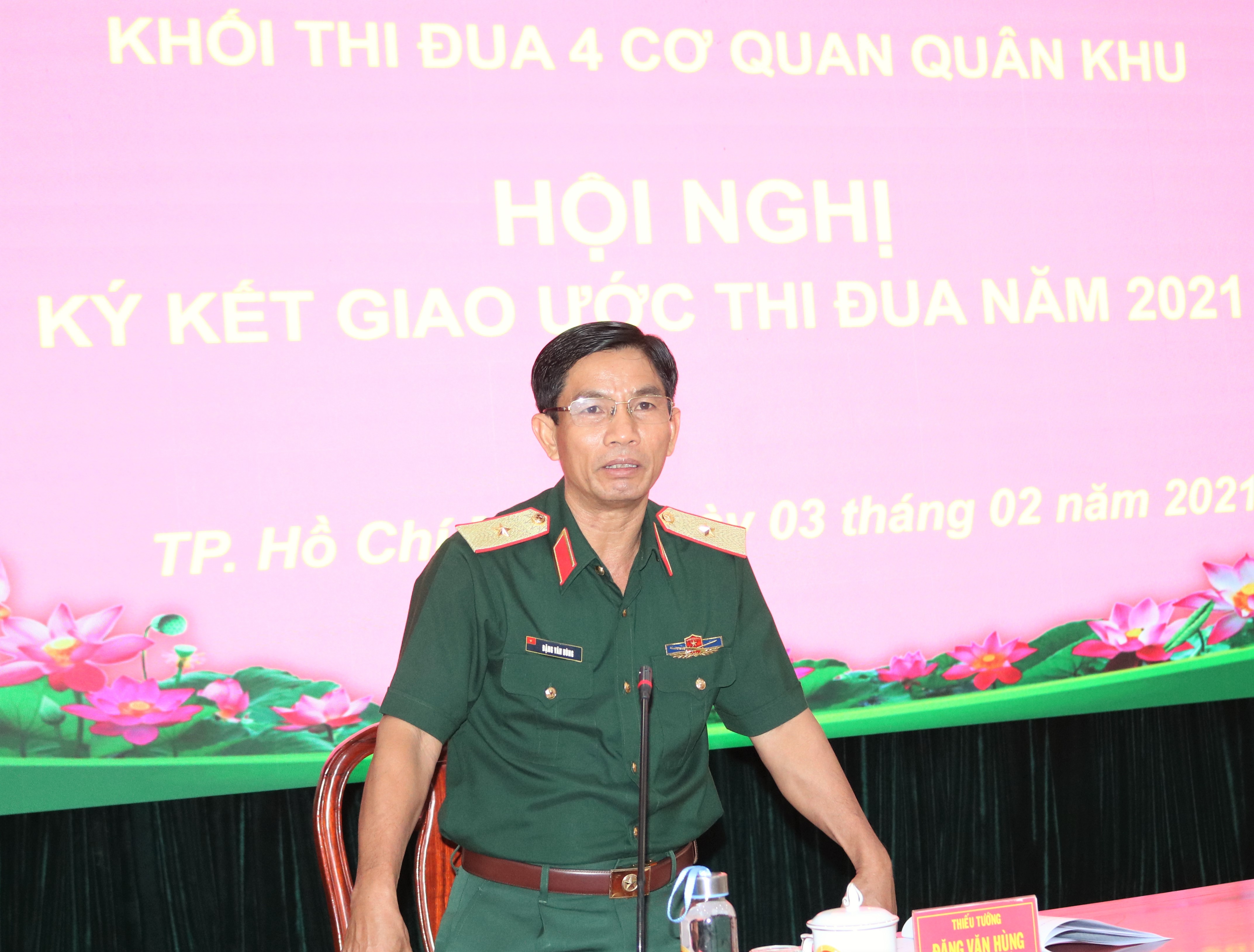 Phát biểu chỉ đạo tại hội nghị, Thiếu tướng Đặng Văn Hùng, Phó Tư lệnh, Tham mưu trưởng Quân khu đề nghị các cơ quan, đơn vị trong Khối thi đua đoàn kết, thống nhất, quyết tâm cao để thực hiện có hiệu quả các nội dung, chỉ tiêu đề ra, thực hiện năm 2021 phải làm tốt hơn năm 2020; đẩy mạnh phong trào thi đua đi vào thực chất, hiệu quả, tập trung thực hiện các khâu đột phá có trọng tâm, trọng điểm, sát với tình hình nhiệm vụ của từng đơn vị; tiếp tục nhân rộng các mô hình hay, điển hình tiên tiến trong LLVT Quân khu. Đồng thời, các cơ quan, đơn vị khẩn trương triển khai hiệu quả các biện pháp phòng, chống dịch Covid-19, góp phần hoàn thành xuất sắc mọi nhiệm vụ được giao.
