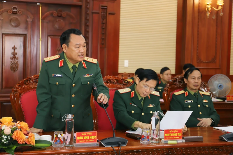 Trung tướng Trần Vinh Ngọc, Bí thư Đảng ủy, Chính ủy Quân khu 7 phát biểu tại hội nghị.