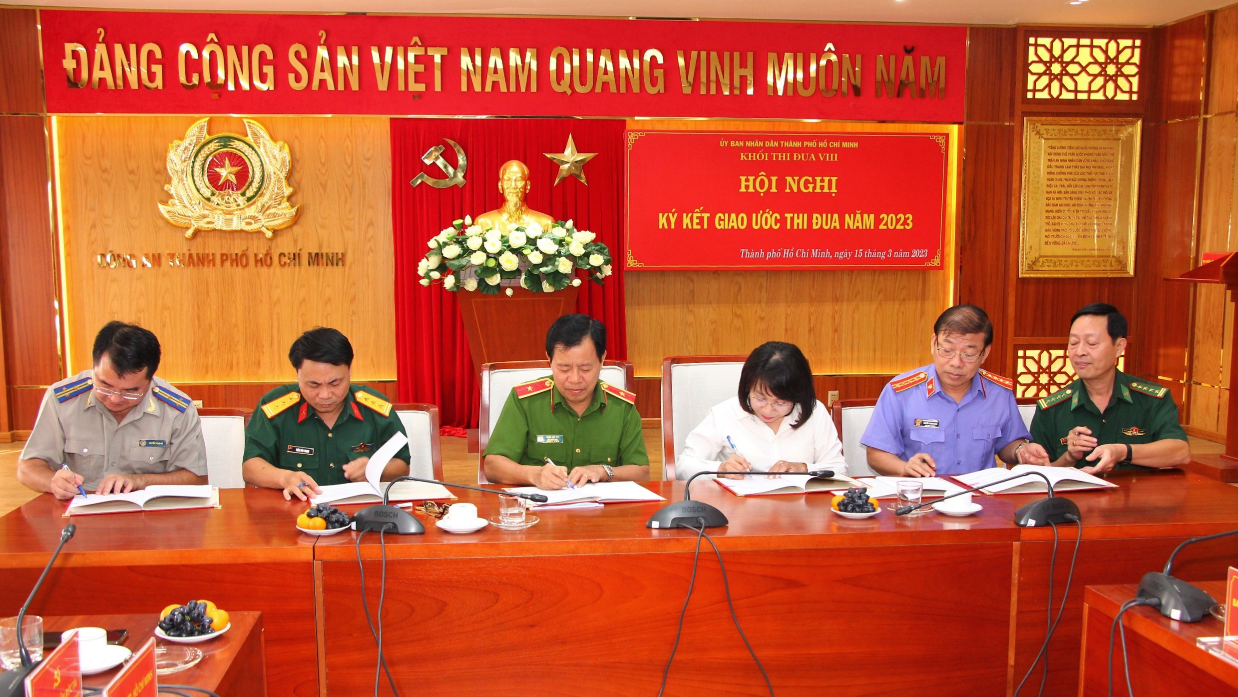 (QK7 Online) - Chiều 15/3, tại Công an TPHCM, Khối thi đua VIII UBND Thành phố gồm Bộ Tư lệnh Thành phố, Bộ Chỉ huy Bộ đội Biên phòng, Công an và các đơn vị thuộc khối Tư pháp của thành phố tổ chức hội nghị ký kết giao ước thi đua năm 2023.
