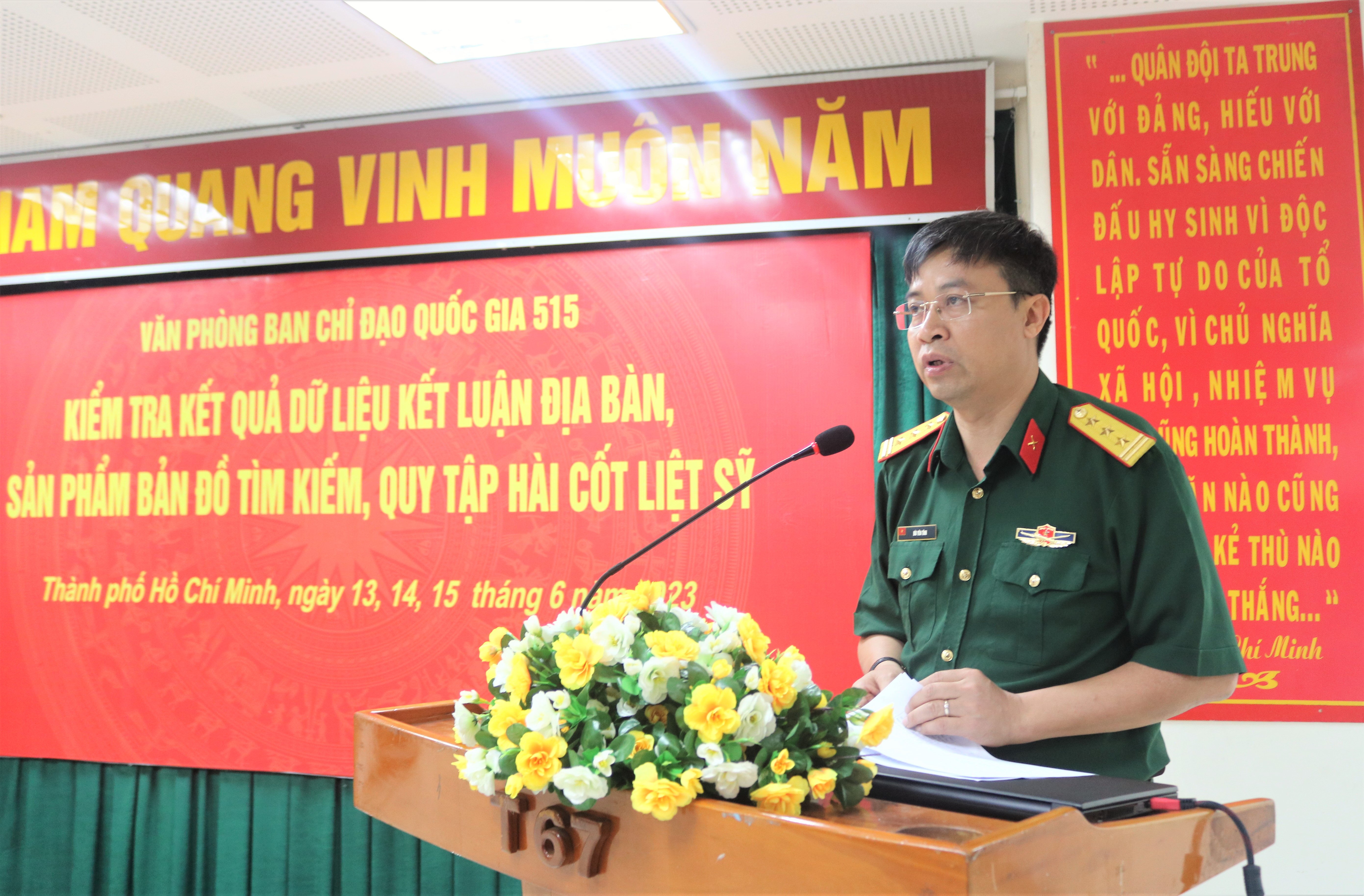Trong thời gian từ ngày 13/6-15/6/2023, Đoàn kiểm tra tiến hành kiểm tra, hướng dẫn chuẩn hóa, hồ sơ, tài liệu, dữ liệu, mẫu biểu kết luận địa bàn, sản phẩm bản đồ tìm kiếm, quy tập hài cốt liệt sĩ Bộ Tư lệnh TP.HCM, Bộ CHQS các tỉnh được triệu tập; triển khai kiểm tra, nghiệm thu hồ sơ sản phẩm các địa phương… với các phương pháp kiểm tra như: Kiểm tra trực tiếp hồ sơ tài liệu của quận, huyện và các xã, phường trên địa bàn quận huyện; kiểm tra văn bản qua phiếu ghi ý kiến kiểm tra và biên bản kiểm tra; chất vấn trực tiếp kiểm tra các văn bản, hồ sơ có liên quan, số liệu trên máy tính...