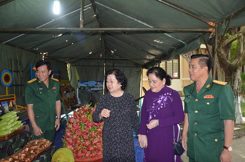Nguyên Phó Chủ tịch nước Trương Mỹ Hoa tham quan các gian trưng bày sản phẩm "cây nhà lá vườn" của Sư đoàn 5.