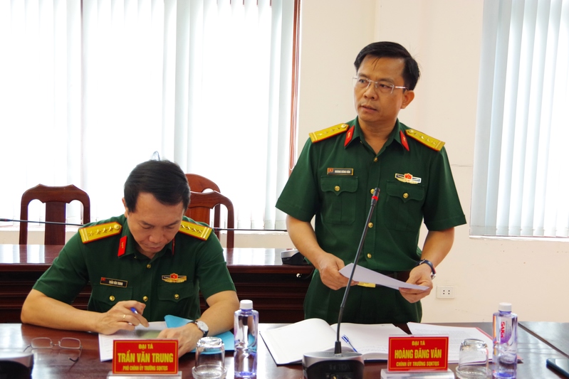 Đại tá Hoàng Đăng Văn, Chính ủy Trường Sĩ quan Kỹ thuật Quân sự phát biểu tại hội nghị.