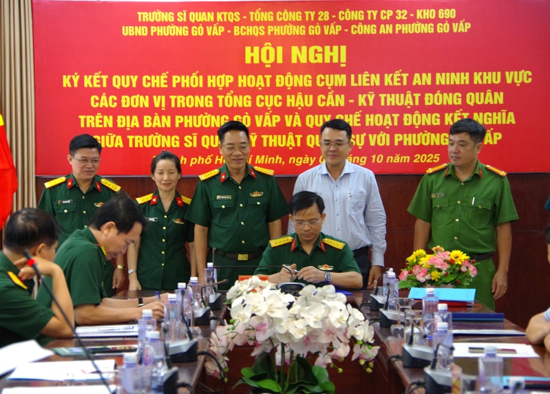 (QK7 Online) – Chiều ngày 7/10, Trường Sĩ quan Kỹ thuật Quân sự phối hợp với các đơn vị trong Tổng cục Hậu cần - Kỹ thuật cùng đóng quân trên địa bàn và cấp ủy, chính quyền địa phương phường Gò Vấp, tổ chức Hội nghị ký kết Quy chế phối hợp hoạt động Cụm liên kết an ninh khu vực và Quy chế kết nghĩa giữa Nhà trường với phường Gò Vấp.