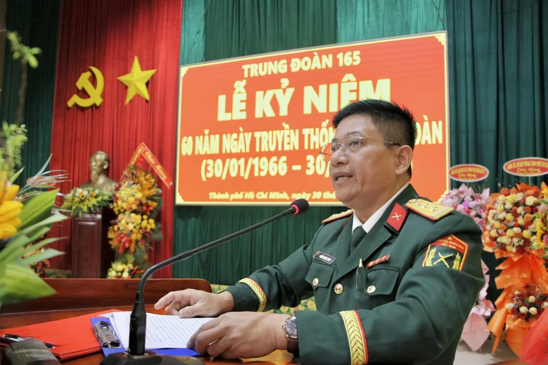Phát biểu tại Lễ kỷ niệm, Thiếu tướng Đặng Văn Lẫm biểu dương, chúc mừng chiến công, thành tích và đóng góp to lớn của các thế hệ cán bộ, chiến sĩ Trung đoàn 165 trong sự nghiệp cách mạng vẻ vang của Đảng, của dân tộc trong suốt 60 năm qua. Đồng chí Phó Tư lệnh Quân khu yêu cầu trong thời gian tới, Trung đoàn 165 tiếp tục quán triệt, triển khai thực hiện tốt nghị quyết, chỉ thị của Đảng, Nhà nước, Quân đội và Quân khu; tăng cường giáo dục chính trị, lãnh đạo tư tưởng cán bộ, chiến sỹ kiên định, phát huy truyền thống đơn vị Anh hùng; nâng cao chất lượng tổng hợp và sức mạnh chiến đấu, thực hiện tốt “3 sẵn sàng”; đẩy mạnh đột phá, phát triển khoa học, công nghệ và chuyển đổi số, đổi mới nội dung, chương trình và nâng cao chất lượng huấn luyện; thực hiện “Huấn luyện thực chất, rèn luyện thực chất, tình huống thực chất”, nâng cao năng lực chỉ huy, hiệp đồng của cán bộ, trình độ kỹ - chiến thuật của chiến sĩ; nâng cao chất lượng xây dựng chính quy, rèn luyện kỷ luật, bảo đảm an toàn, xây dựng cấp ủy, tổ chức Đảng trong sạch vững mạnh, Trung đoàn vững mạnh toàn diện, “Mẫu mực, tiêu biểu”; bảo đảm hậu cần, kỹ thuật, đẩy mạnh tăng gia sản xuất, đón tết Nguyên đán 2026 và đón nhận chiến sĩ mới.