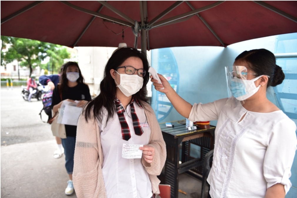 Thí sinh đo thân nhiệt và xuất trình thẻ dự thi, giấy chứng nhận đã xét nghiệm COVID-19 để vào điểm thi Trường THPT Nguyễn Hữu Thọ (Q.4, TP.HCM) - Ảnh: NGỌC PHƯỢNG