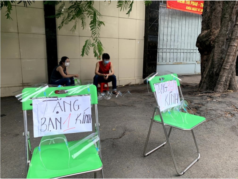 Ngay cạnh cổng trường thi, nhiều người dễ dàng nhận thấy 2 chiếc ghế với dòng chữ "tặng bạn 1 kính" đặt nhiều kính che mặt chắn giọt bắn có gọng gương. Ngay tại đó, có 2 người liên tục đặt thêm lên ghế những tấm kính che mặt sau khi có người lấy.