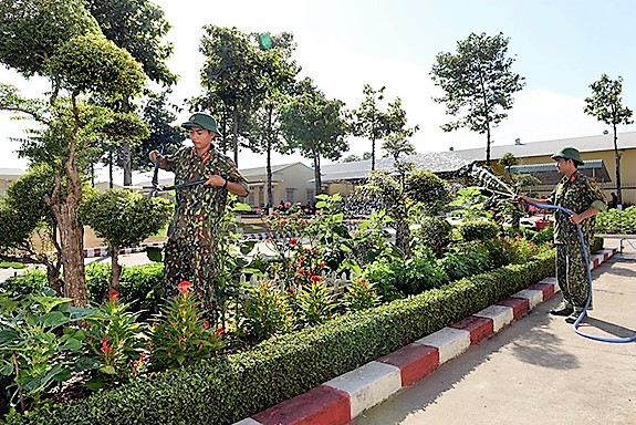 Đi trên đoạn đường đủ sắc cờ, hoa, nghe âm vang lời bài hát “xuân, xuân ơi, xuân đã về” phát ra từ chiếc loa truyền thanh nội bộ khiến lòng người chộn rộn, lâng lâng. Từng tốp chiến sĩ vui cười, vừa làm công tác chuẩn bị đón Tết, vừa chuyện trò, tâm sự Tết quê. Trên gương mặt những chàng lính trẻ rạng rỡ nụ cười, ấm tình đồng chí. Binh nhất Đặng Quang Vũ, 23 tuổi, chiến sĩ Đại đội 5 (Tiểu đoàn 276) quê ở huyện Bắc Tân Uyên (Bình Dương), hồ hởi khoe: “Chúng tôi đang chăm sóc vườn hoa hướng dương và tạo dáng cho cây cảnh để chuẩn bị đón mừng xuân mới. Đây là năm đầu tiên tôi đón Tết trong quân ngũ. Nghe Chính trị viên đại đội thông báo, đêm Giao thừa sẽ có nhiều tiết mục hấp dẫn và vui chơi có thưởng, tôi rất háo hức. Dù có đôi chút nhớ nhà, nhưng tôi đã xác định tư tưởng, an tâm hoàn thành tốt nhiệm vụ”.