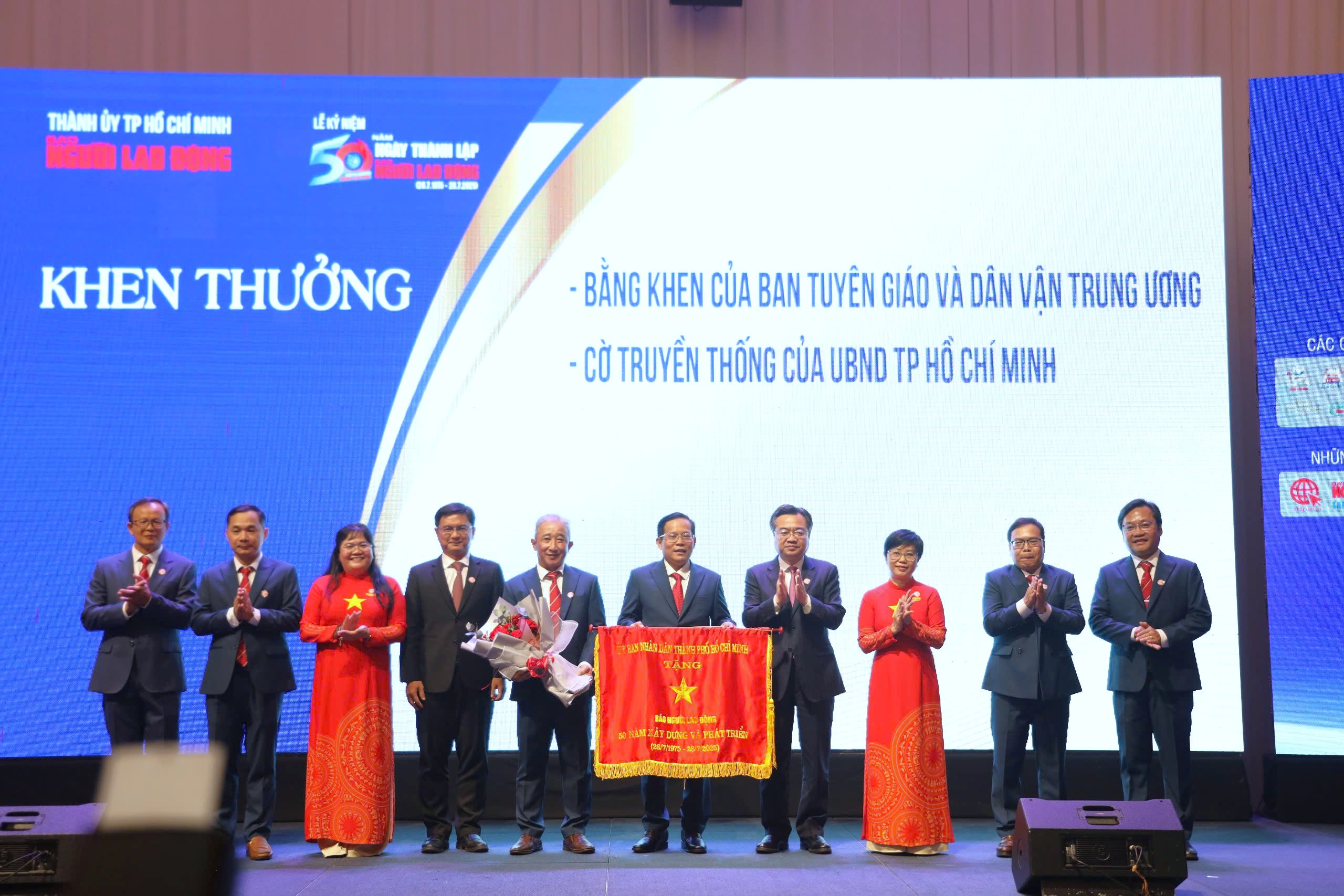 Đồng chí Nguyễn Thanh Nghị, Ủy viên Trung ương Đảng, Phó Bí thư Thường trực Thành ủy TPHCM trao cờ truyền thống cho Ban biên tập Báo Người Lao Động.