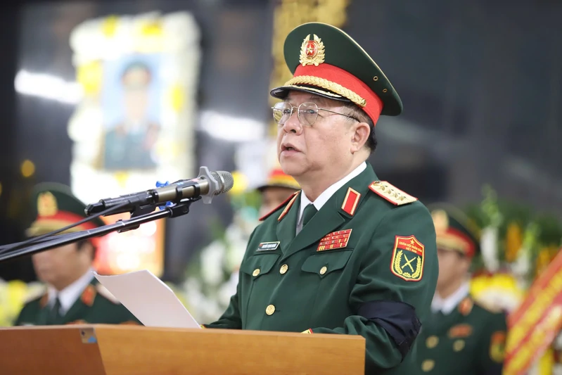 Đồng chí Nguyễn Trọng Nghĩa, Ủy viên Bộ Chính trị, Bí thư Trung ương Đảng, UVTV Quân ủy Trung ương, Chủ nhiệm Tổng cục Chính trị, Trưởng ban Tổ chức lễ tang phát biểu tại lễ truy điệu.