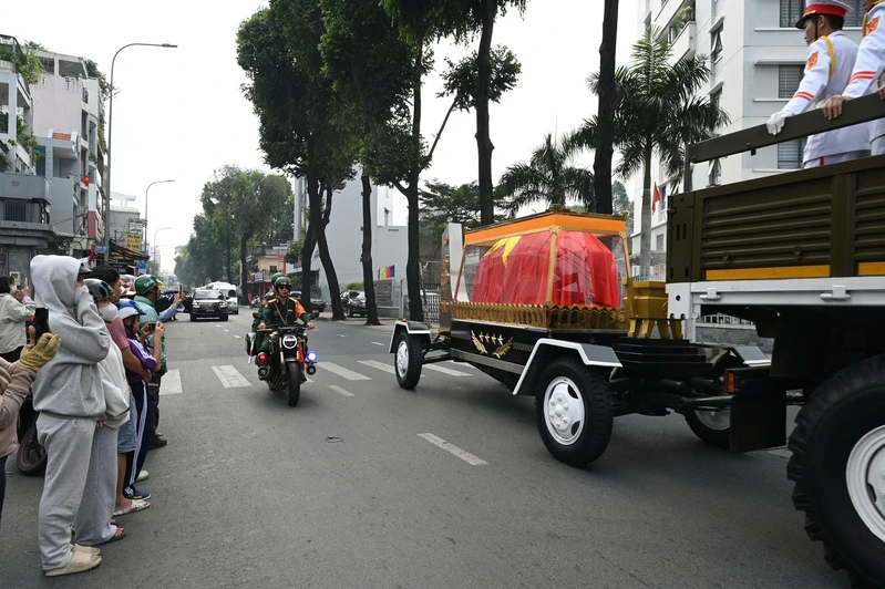 Xe tang đưa linh cữu đồng chí rời Nhà Tang lễ Quốc gia phía Nam về quê nhà xã Phú Túc, tỉnh Vĩnh Long.