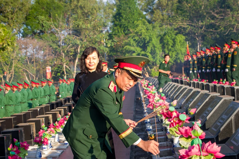 Thiếu tướng Trần Đức Thắng, Phó Chủ nhiệm Chính trị Quân khu 7 cùng các đại biểu dâng hương tưởng niệm các Anh hùng liệt sĩ.
