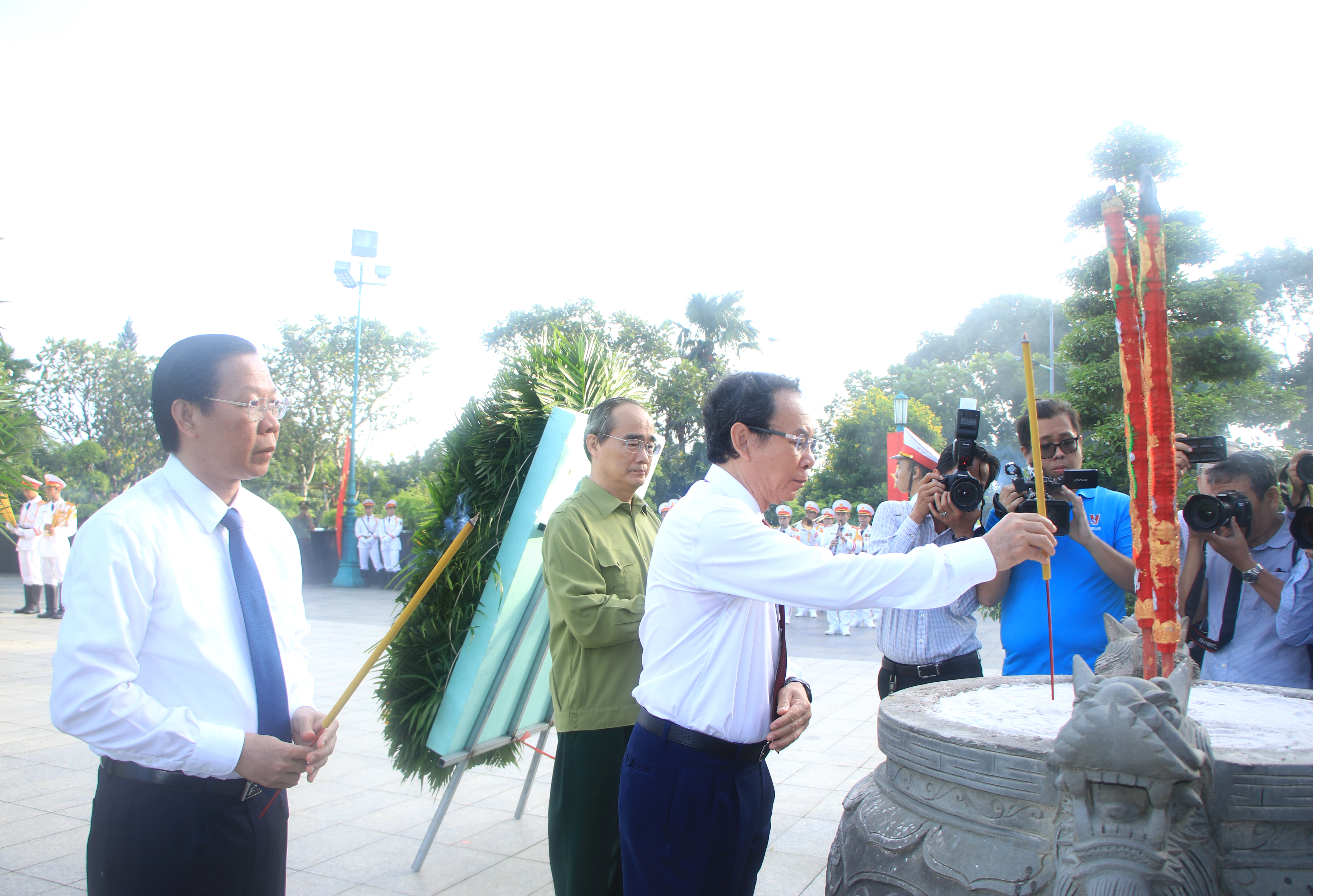 Đồng chí Nguyễn Văn Nên, Ủy viên Bộ Chính trị, Bí thư Thành ủy TPHCM và các đại biểu dâng hương tưởng niệm các anh hùng, liệt sĩ tại Nghĩa trang liệt sĩ Thành phố Hồ Chí Minh.