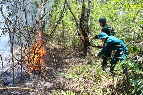 (QK7 Online) - Ngày 7/4/2018, xảy ra cháy rừng tại khu vực Bưng Trường, thuộc xã Hàm Minh, huyện Hàm Thuận Nam, tỉnh Bình Thuận, đây là khu vực rừng thuộc Khu bảo tồn thiên nhiên Tà Cú. “Ngay sau khi nhận được tin báo, xác định đây là việc cấp bách, phải nhanh chóng đi cứu rừng. Ban CHQS huyện chúng tôi tổ chức hội ý nhanh, triển khai ngay vật chất, phương tiện, lực lượng cơ động đến ngay khu rừng bị cháy để dập lửa” Trung tá Lâm Thành Vinh, Phó Chỉ huy trưởng Ban CHQS huyện Hàm Thuận Nam cho biết. Suốt nhiều giờ đồng hồ, 35 cán bộ, chiến sĩ, dân quân tự vệ cùng hơn 30 kiểm lâm của Khu Bảo tồn thiên nhiên Tà Cú và đội kiểm lâm phòng cháy chữa cháy cơ động của tỉnh Bình Thuận căng mình dập tắt đám cháy rừng. Lực lượng được chia ra các đội, đến các điểm cháy, chặt cây, dọn đường băng cách ly điểm cháy.