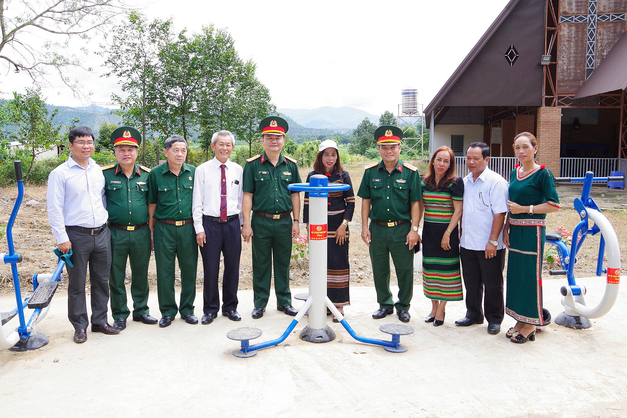 Đại tá Bùi Đăng Ninh, Chính ủy Bộ CHQS tỉnh Đồng Nai và các đại biểu tại lễ trao tặng công trình TDTT cho xã ĐakLua, huyện Tân Phú.