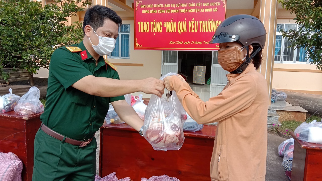(QK7 Online) - Tiếp tục thực hiện chương trình "Món quà yêu thương", ngày 11/7, tại Trung tâm văn hóa học tập cộng đồng xã Bàu Chinh, Ban CHQS huyện Châu Đức đồng hành cùng Đại đức Thích Chiếu Hiền, Trưởng Ban trị sự Giáo hội Phật giáo Việt Nam huyện và các nhà hảo tâm của đoàn thiện nguyện xã Bình Giã tổ chức trao tặng “Món quà yêu thương” cho 50 hộ gia đình có hoàn cảnh khó khăn trong phòng, chống dịch Covid-19 trên địa bàn xã Bàu Chinh, huyện Châu Đức.
